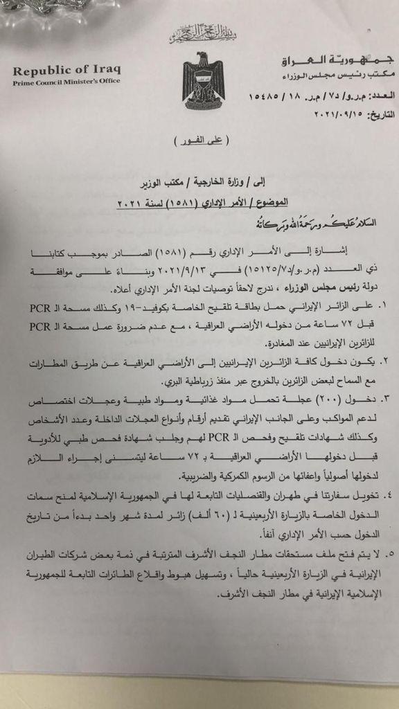 البيان وبلهجته الشديدة، الذي قرر معاقبة الخطوط الجوية العراقية وحرمانها من نقل المسافرين والزائرين الايرانيين والإيرادات التي من الممكن استحصالها جراء ذلك، جاء بالتزامن مع "تسهيلات" منحها مكتب رئيس الوزراء مصطفى الكاظمي ووفق كتاب فوري وجه إلى وزارة الخارجية العراقية، تضمن عدم فتح ملف مستحقات مطار النجف الأشرف المترتبة بذمة شركات الطيران الإيرانية في الزيارة الاربعينية الحالية وتسهيل هبوط وإقلاع الطائرات الإيرانية في مطار النجف.