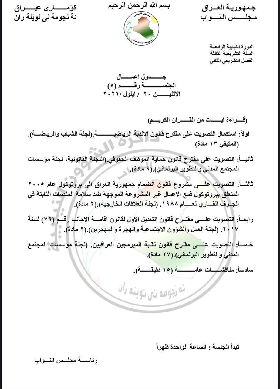 أظهر جدول اعمال جلسة مجلس النواب المقرر عقدها الاثنين المقبل، 6 فقرات تضمنت التصويت واستكمال التصويت على 5 قوانين، فضلا عن فقرة للمناقشات العامة.