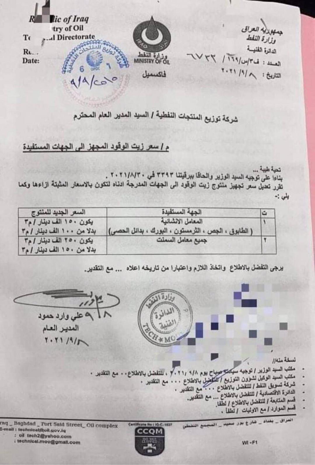 وتضمنت الوثائق المسربة خلال الايام الماضية رفع أسعار زيت الوقود على معامل الاسفلت إلى مايصل لـ250 ألف دينار صعودًا من 150 ألف دينار، فيما يتم رفع الوقود على معامل الطابوق والجص والثرمستون وبدائل الحصى الى 150 ألف بدلا من 100 ألف، بالاضافة الى رفع اسعار الوقود على معامل الاسمنت كافة إلى 250 ألف دينار بدلًا من 150 ألف دينار.