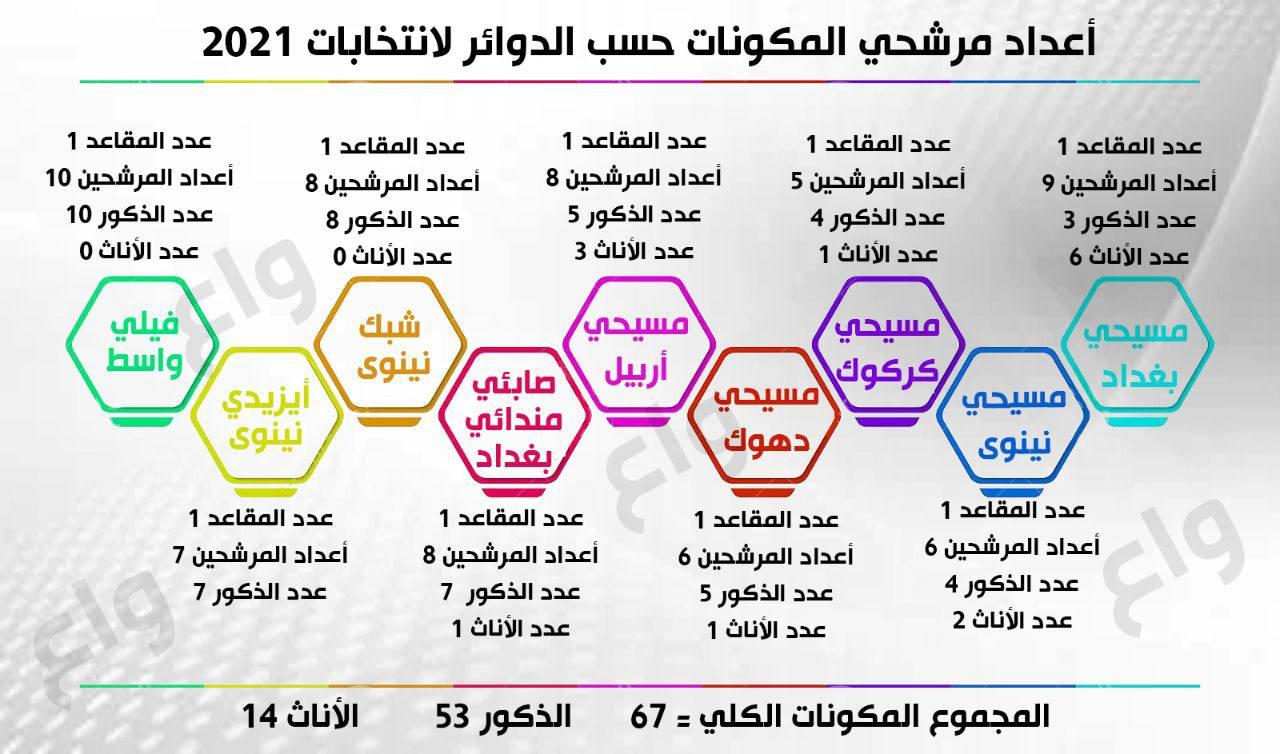ويتوزع المرشحون الـ67، بواقع 53 مرشحا من الذكور و14 من الاناث، لشغل 5 مقاعد للمسيح، ومقعد للصابئة المندائيين، ومقعد للشبك واخر للإيزيديين، ومقعد اخير للفيليين.