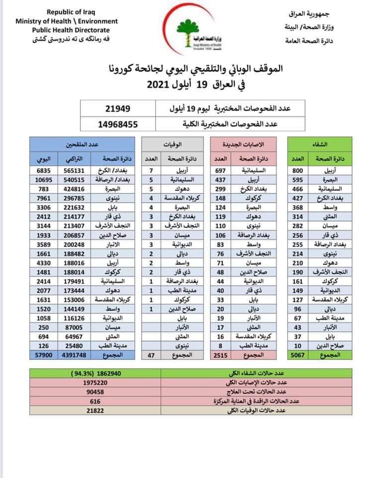 وأضاف البيان، أن "حالات الوفاة الجديدة بكورونا بلغت 47 حالة في عموم محافظات البلاد"، لافتا إلى أن "عدد الذين تلقوا اللقاح خلال الساعات الـ24 الأخيرة بلغ 57900".