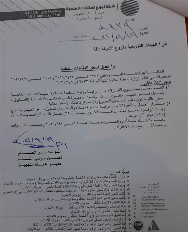 ووفقا لكتاب مذيل بتوقيع المدير العام لشركة توزيع المنتجات النفطية علي وارد حمود، فإنه بناءً على توجيه وزير النفط تقرر تعديل سعر منتج زيت الوقود لمعامل المواد الانشائية.