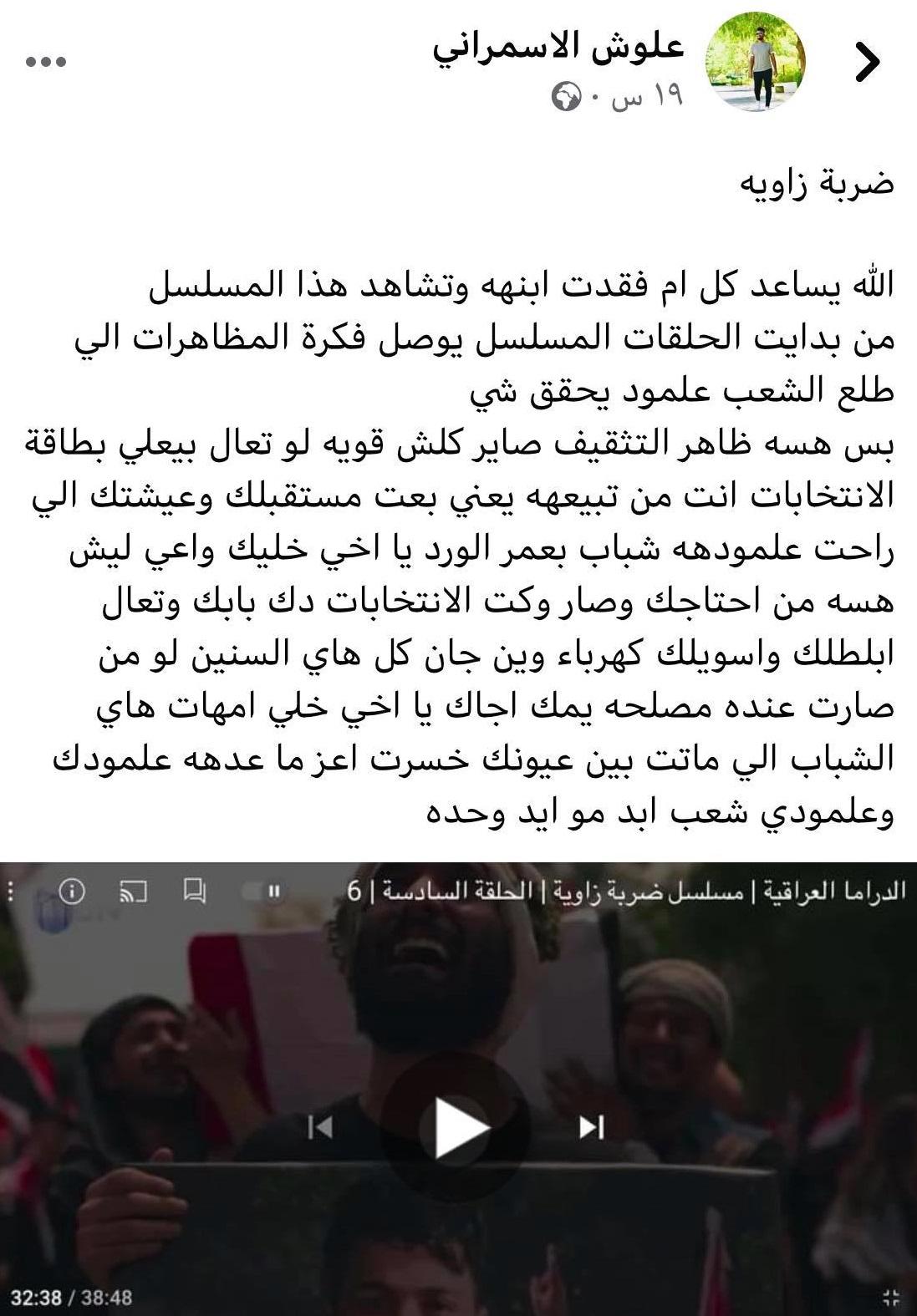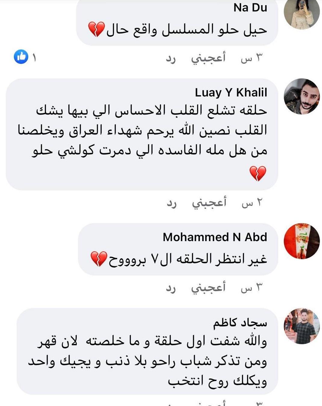 من جانبه كتب أحد مستخدمي مواقع التواصل الاجتماعي تعليقًا على المسلسل: "الله يساعد كل ام فقدت ابنهه وتشاهد هذا المسلسل، من بداية الحلقات المسلسل يوصل فكرة المظاهرات الي طلع الشعب علمود يحقق شي بس هسه ظاهر التثقيف صاير كلش قوي، لو تعال بيعلي بطاقة الانتخابات، انت من تبيعهه يعني بعت مستقبلك وعيشتك الي راحت علمودهه شباب بعمر الورد يا اخي خليك واعي... يا اخي خلي امهات هاي الشباب الي ماتت بين عيونك خسرت اعز ما عدهه علمودك وعلمودي".