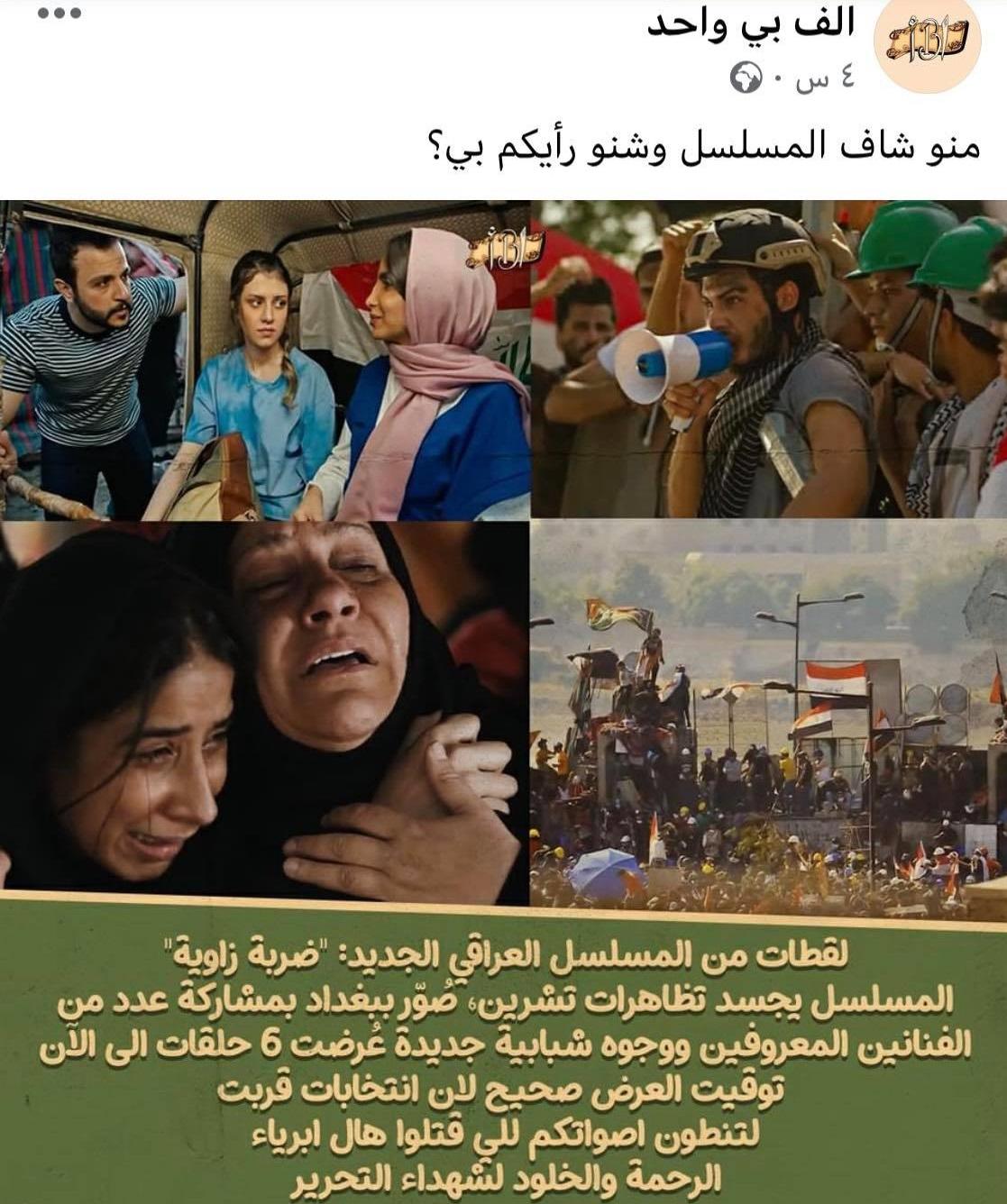 انشغلت مواقع التواصل الاجتماعي خلال الايام القليلة الماضية بمسلسل عراقي جديد يتحدث عن أجواء تظاهرات تشرين واعتمد في العديد من حلقاته على مشاهد حقيقية من داخل ساحة التحرير، حيث تمكن المسلسل من مخاطبة عاطفة المشاهدين بشكل كبير لما اعتمدته القصة من إظهار مأساة المحتجين وتعرضهم للقتل والتنكيل خصوصا مع تسليط الضوء على حياتهم اليومية البسيطة.