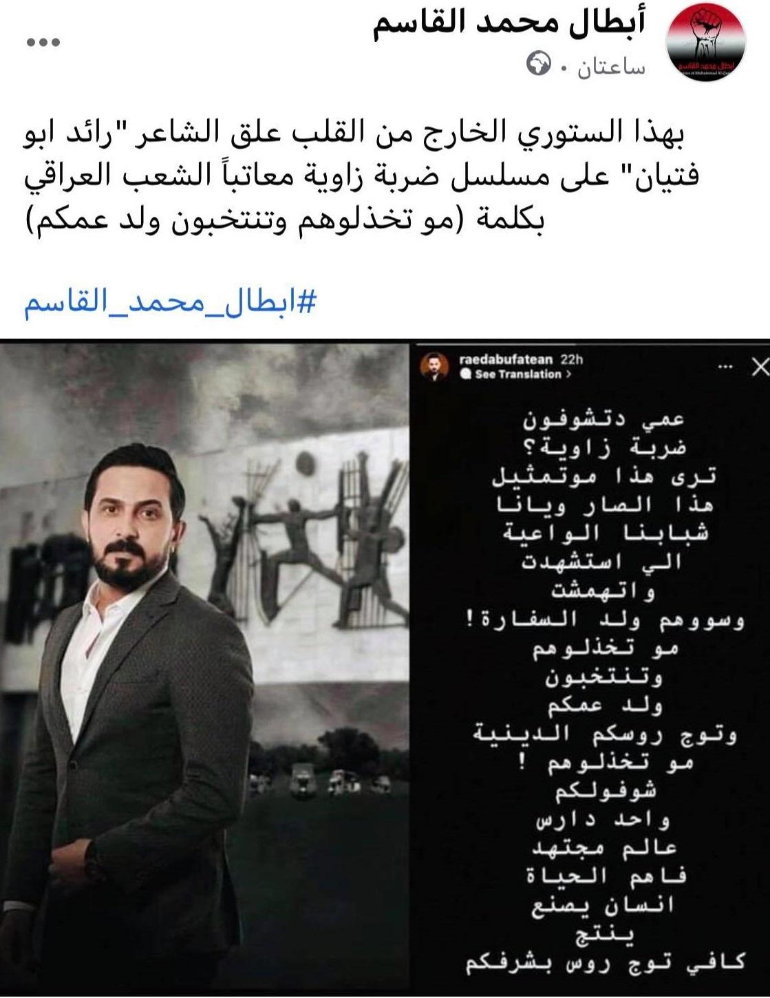 وعلى رأس الشخصيات التي تلقت هذه الرسالة الصريحة الشاعر البارز رائد أبو فتيان، والذي كتب كلمات تحت تأثير واضح للانفعالات العاطفية، بأن أحداث "ضربة زاوية" ليس تمثيلًا بل هذا ماجرى على المتظاهرين بالضبط، مشددًا على ضرورة عدم خذلان الشباب الذين قتلوا، قائلًا: "شبابنا الواعية الي استشهدت واتهمشت مو تخذلوهم وتنتخبون ولد عمكم وتوج روسكم الدينية، شوفولكم واحد دارس فاهم يصنع ينتج".