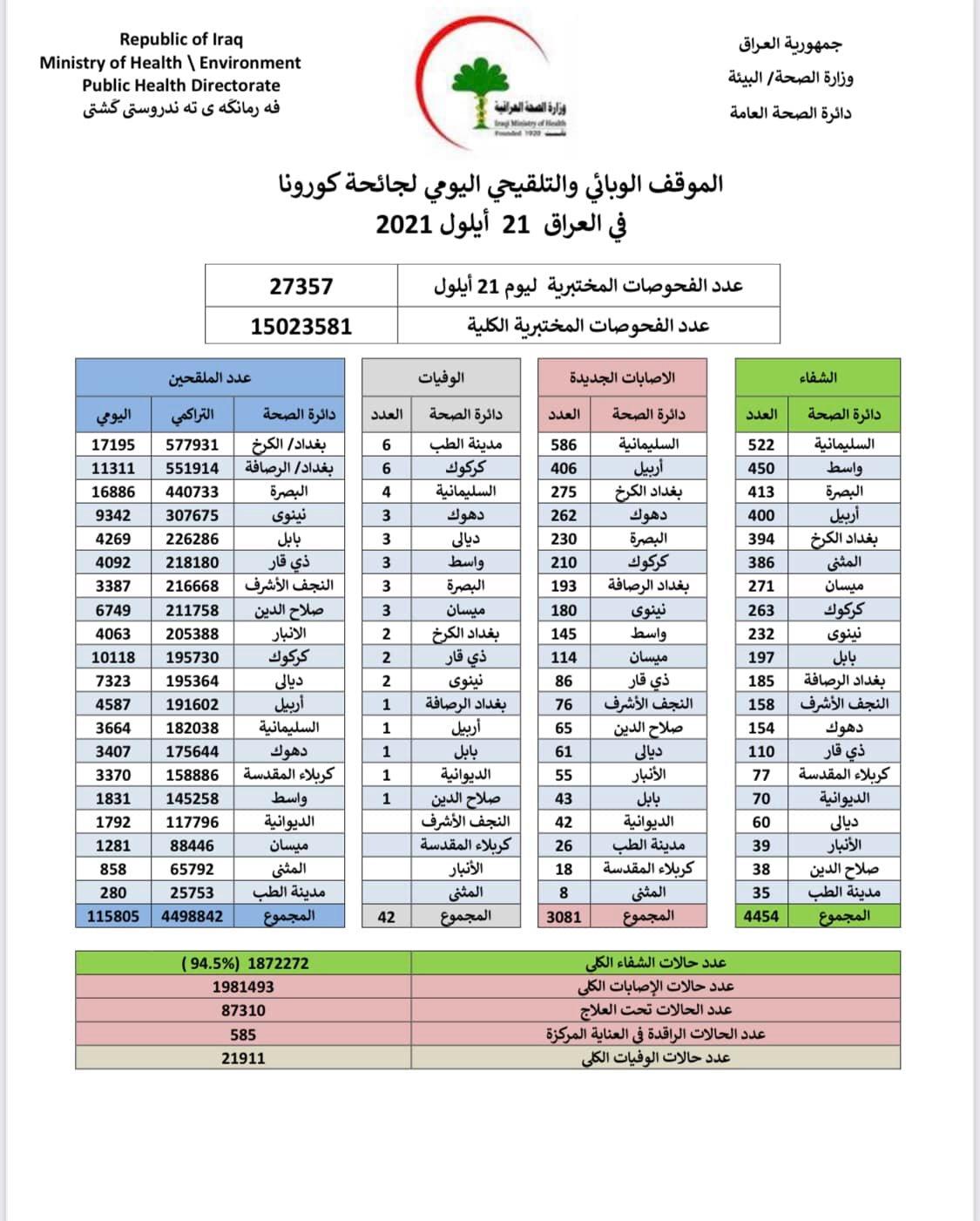واظهر الموقف الوبائي الذي اعلنته وزارة الصحة واطلعت عليه (المدى)، تسجيل 4454 حالة شفاء جديدة، فضلا عن 42 حالة وفاة.