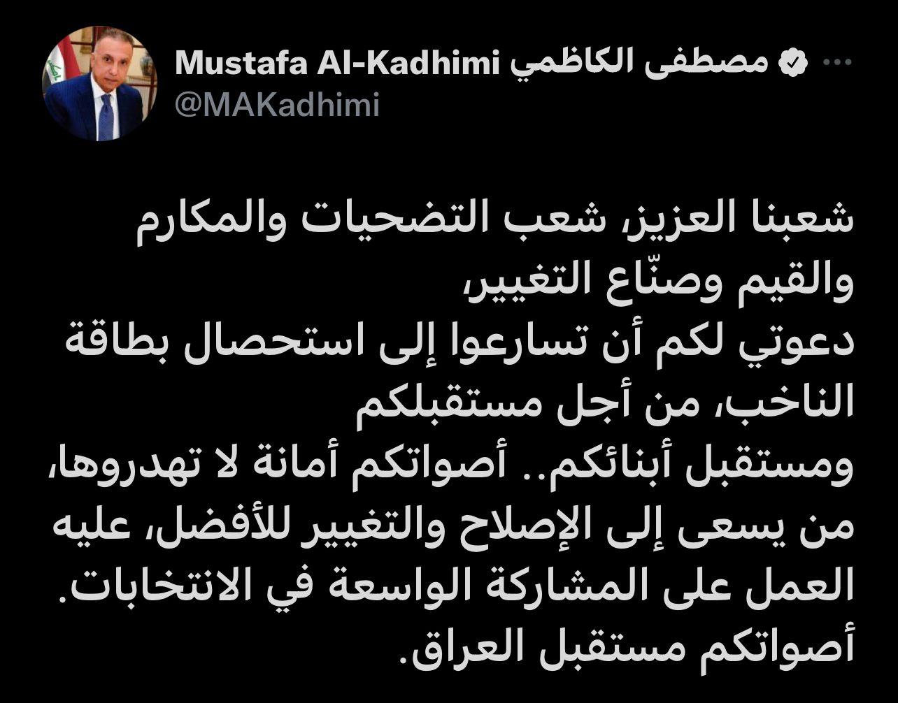 وقال الكاظمي في تغريدة اطلعت عليها (المدى): "شعبنا العزيز، شعب التضحيات والمكارم والقيم وصنّاع التغيير، دعوتي لكم أن تسارعوا إلى استحصال بطاقة الناخب، من أجل مستقبلكم ومستقبل أبنائكم".