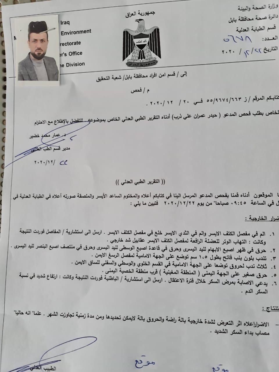 المتهم المحكوم (حيدر عمران علي)، أرفق عدة تقارير ووثائق مع رسالته والتي اطلعت عليها (المدى)، ومن بين الأوراق مايثبت تعرضه للتعذيب بالفعل.