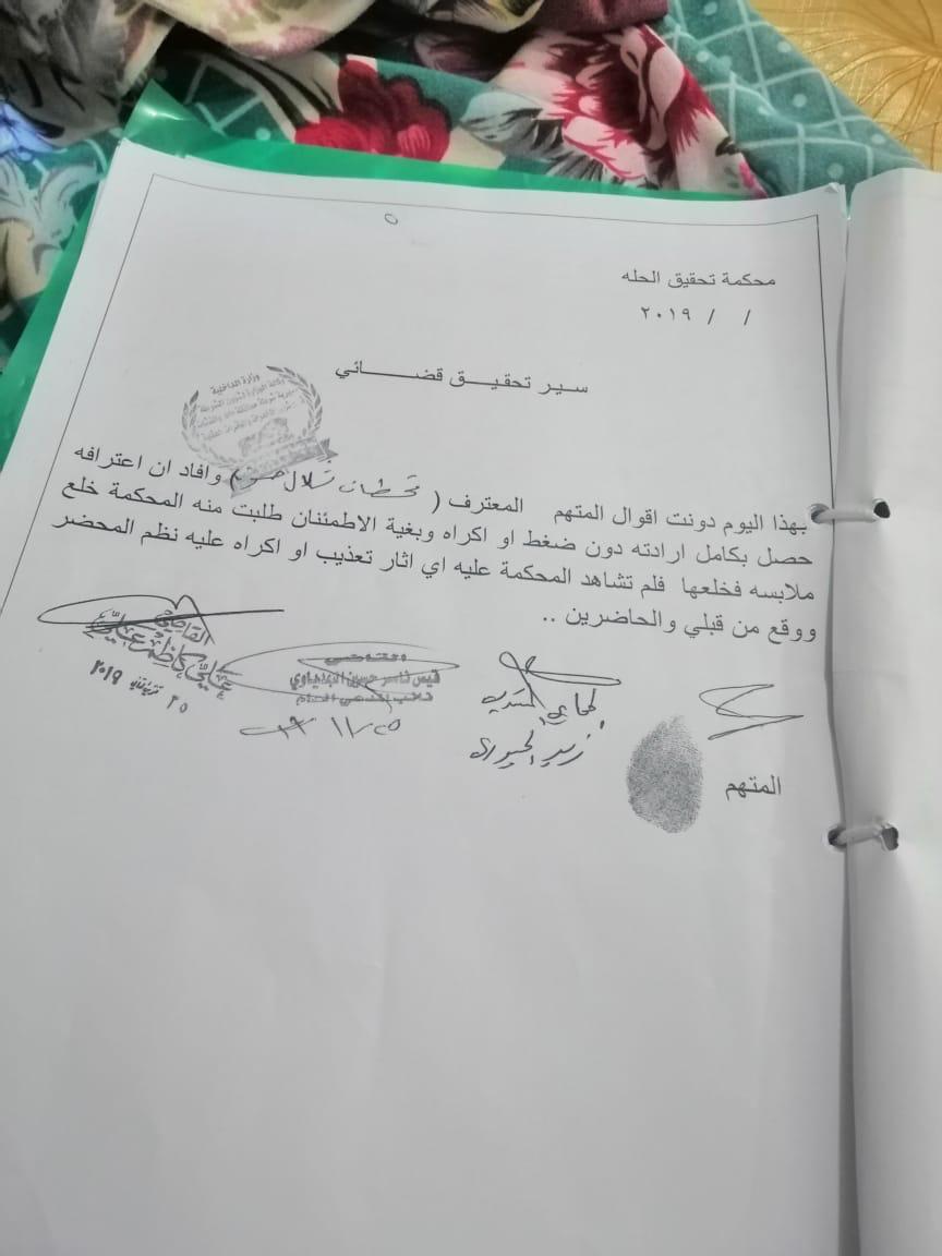 ويضيف أني "لم اقتنع بالقرار فقد قدمت ادلة وحقائق قانونية وبإمكان اي شخص قانوني سماعها او الاطلاع عليها وهي موجودة ومثبتة في أوراق الدعوة وتتضمن التلاعب الواضح من قبل ضابط التحقيق الملازم (علي وليد ماضي) باستغلال وظيفته بأزالتها من داخل ملف الأوراق التحقيقية حتى يتم ادانتي واني ادرجها لكم ليتم عرضها على الرأي العام ليطلع عليها جميع الحقوقيين وأصحاب الشأن ليثبتوا اني صاحب حق".