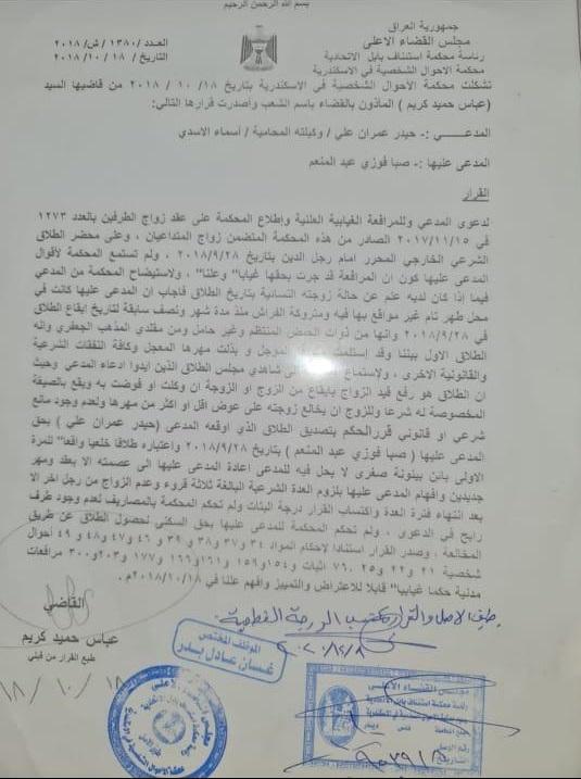 ولم تتضمن الوثائق المرفقة من (حيدر عمران علي) وثيقة تتحدث عن القرار الصادر بوجود التهديد من قبل زوجته او اقامة شكوى، بل اورد وثيقة تثبت قيامه بطلاقها في المحكمة.