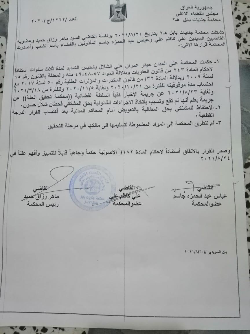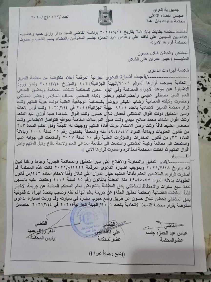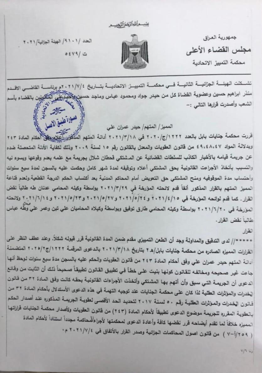 ويضيف المتهم المحكوم (حيدر عمران علي) إنه "صدر الحكم المجحف بحقي بالسجن (سبع سنوات)، ولكوني صاحب حق ولم اترك حقي ورغم ادانتي ظلما وبهتانا فقد قمت بتقديم الطعن بقرار الحكم لدى رئاسة التمييز، وقررت نقض قرار الحكم وخففت إلى (ثلاث سنوات) بإعادة المحاكمة من جديد وتم ذلك.