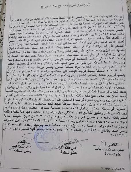 المتهم المحكوم (حيدر عمران علي)، أخرج رسالة وردت لـ(المدى)، ومن غير المعلوم ما إذا كان هو من كتبها من السجن أم كلف أحدا ما ليكتبها عنه، تضمنت الرسالة تفاصيل قضيته التي تلخصت بأنه متهم بالاخبار الكاذب على شخص يدعى "قحطان شلال حسون" والقيام بوضع مخدرات في سيارته لتوريطه، وبالاتفاق مع ضباط.