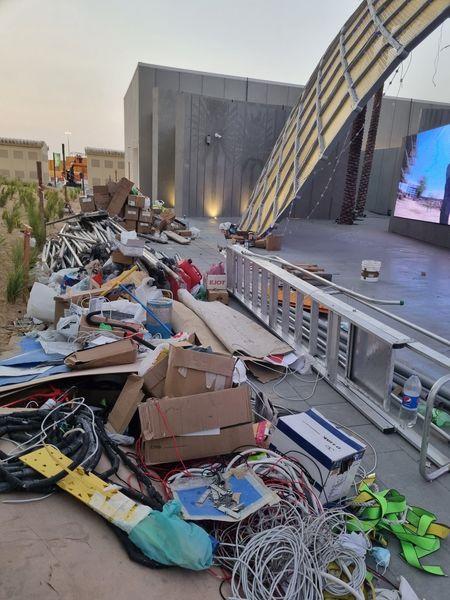 وبينما دشنت جميع الأجنحة الدولية المشاركة في المعرض والتي يصل عددها لأكثر من 190 دولة، استقبال الضيوف والزائرين واطلاعهم على الفقرات والابتكارات المعروضة، لايزال الجناح العراقي شبه مهجور، ولم يكتمل العمل به وتنتشر الأوساخ ومخلفات العمل بقربه، وبالتالي عدم جذبه للزائرين، بحسب اللقطات ومقاطع الفيديو المتداولة في مواقع التواصل الاجتماعي واطلعت عليها (المدى).