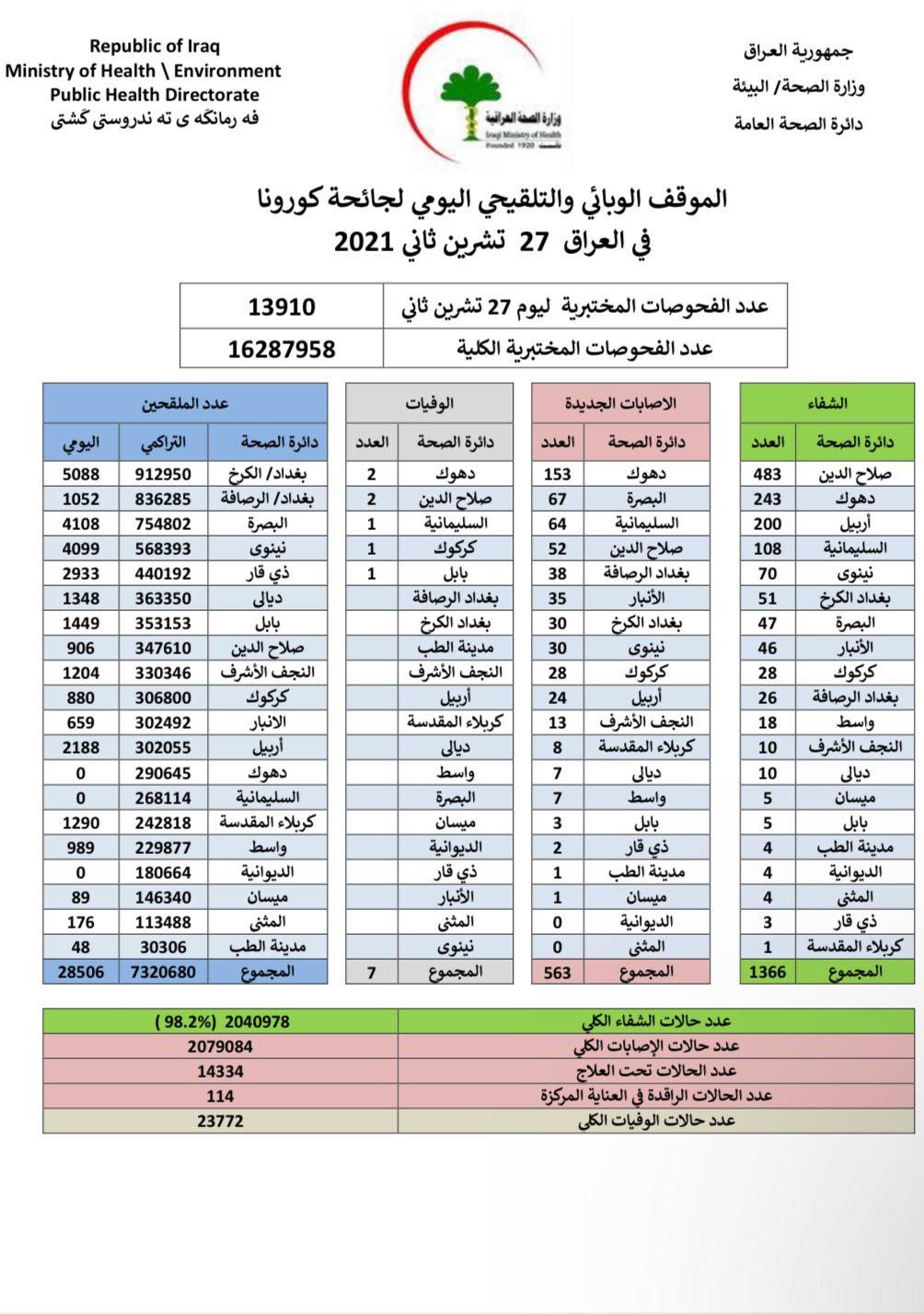 واظهر الموقف الوبائي تسجيل 1366 حالة شفاء، و7 حالات وفاة، فضلا عن تطعيم اكثر من 28 الف شخص بلقاح كورونا.
