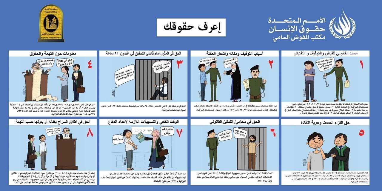 نشر مكتب حقوق الانسان التابع للامم المتحدة لائحة بحقوق كل مواطن عراقي بعد توقيفه من قبل السلطات ولضمان منع التعذيب كما يضمنها القانون العراقي.