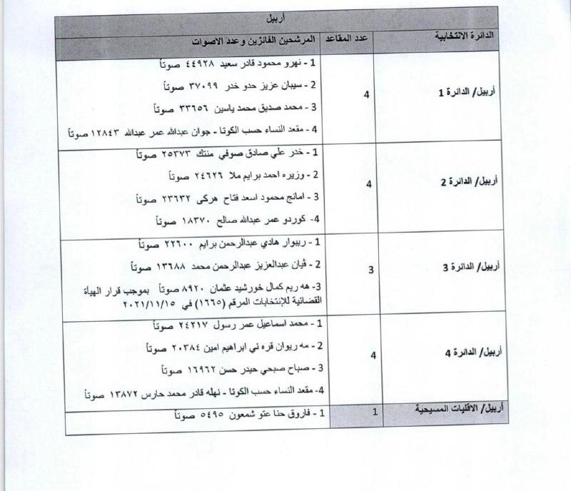 أسماء النواب الفائزين في انتخابات تشرين عن محافظة أربيل: