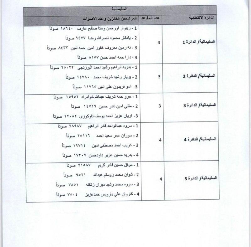 أسماء النواب الفائزين في انتخابات تشرين عن محافظة السليمانية: