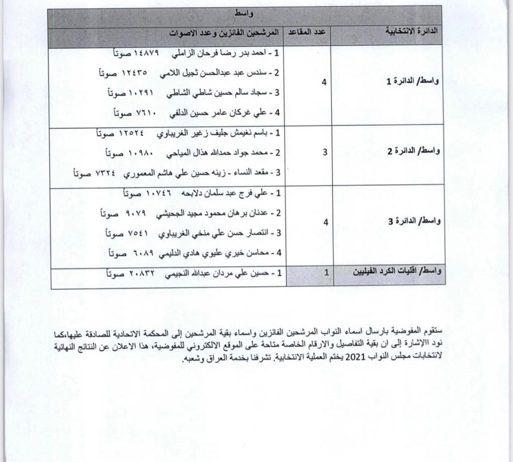 أسماء النواب الفائزين في انتخابات تشرين عن محافظة واسط: