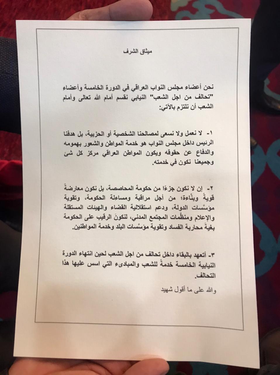 واعلن التحالف في بيانه الختامي، الذي اطلعت عليه (المدى)، انه "لن يكون جزء من المحاصصة السياسية، بل يكون معارضة قوية وبناءة، من اجل مراقبة ومساءلة الحكومة ، وتقوية مؤسسات الدولة، ودعم استقلالية القضاء والهيئات المستقلة".