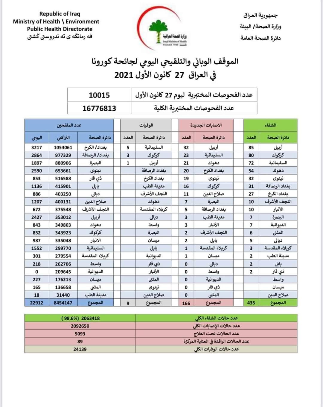 وذكرت الوزارة في بيان تلقته (المدى)، أن "الكوادر الصحية في عموم المحافظات العراقية سجلت 166 إصابة جديدة بفروس كورونا، فيما تماثل 435 مصاباً إلى الشفاء".