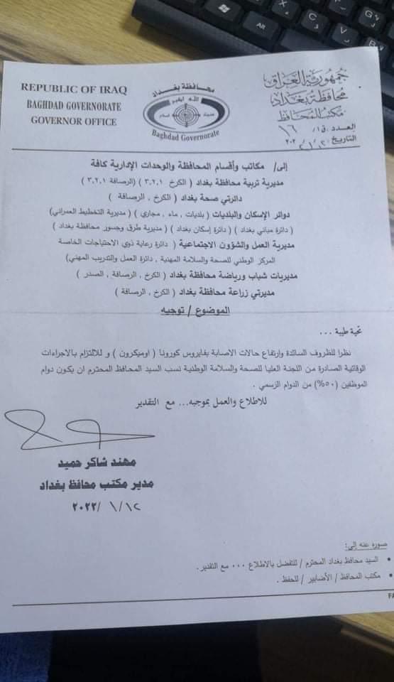 وثيقة: تقليص الدوام الرسمي 50% في بغداد