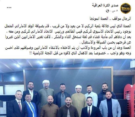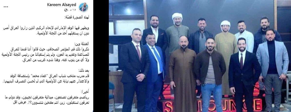 وقال الاعلامي كريم السيد في تدوينة تابعتها (المدى) معلقًا على صورة الوفد مع عماد محمد، قائلًا: "يظهر في الصورة الوفد الإماراتي لاتحاد الركبي الذين زاروا العراق أمس دون ان يستقبلهم أحد من اللجنة الأولمبية".