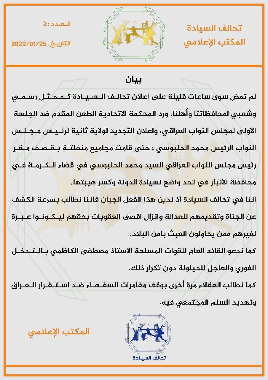 تحالف السيادة يدين قصف مقر رئيس البرلمان في الكرمة
