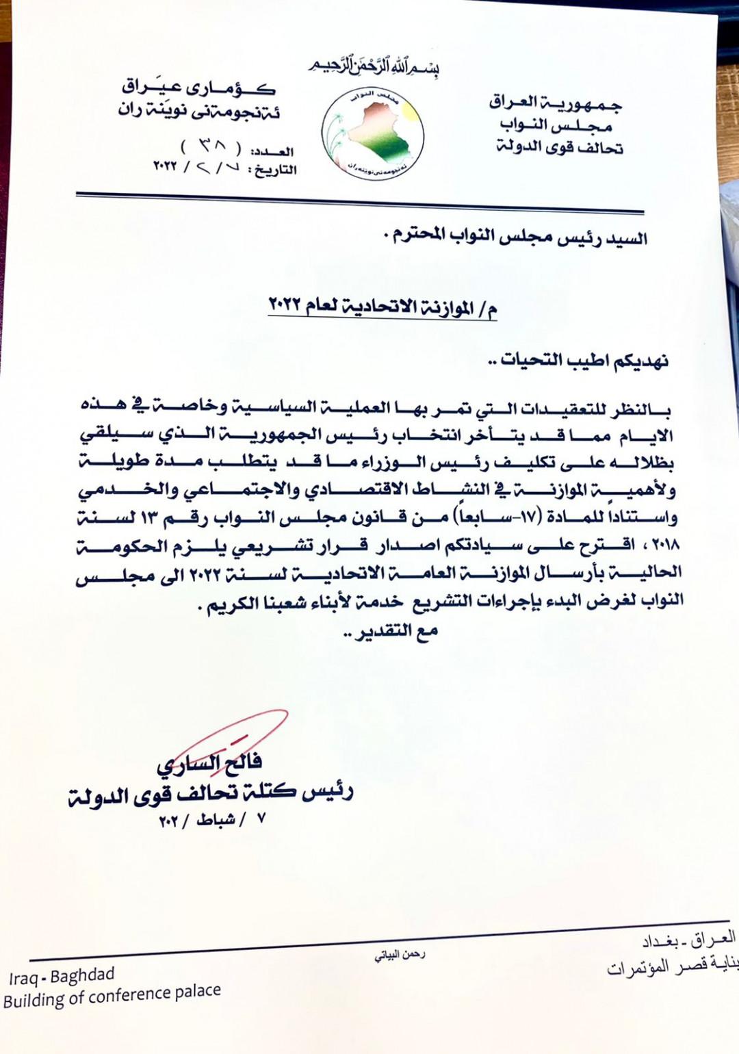 ونبه الساري، في كتاب رسمي وجهه الى رئيس مجلس النواب محمد الحلبوسي، حصلت عليه (المدى)، إلى خطورة انعكاس الازمة السياسية على تأخر اقرار الموازنة العامة لعام 2022 بسبب تعقيدات تسمية رئيس الجمهورية وتشكيل الحكومة.