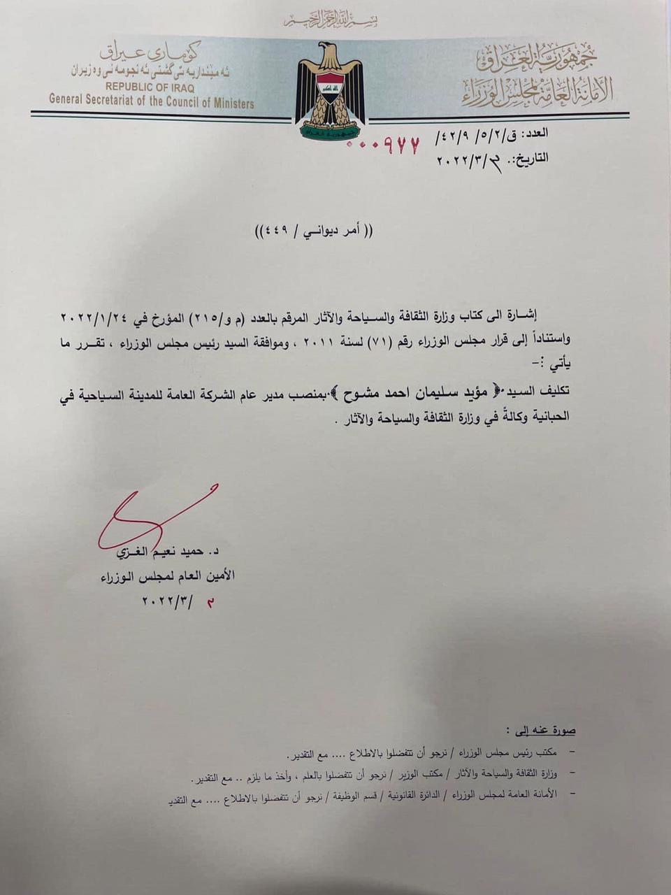 اصدرت الامانة العامة لمجلس الوزراء، قرارا بتكليف مؤيد سلمان احمد مشوح، بمنصب مدير المدينة السياحية في الانبار، وفقا لوثيقة حصلت عليها (المدى).