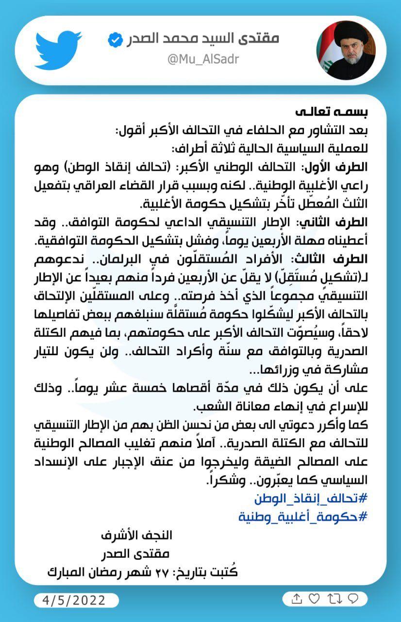 وقال الصدر في تغريدة له تابعتها (المدى)، "بعد التشاور مع الحلفاء في التحالف الأكبر، أقول للعملية السياسية الحالية، الطرف الأول التحالف الوطني الأكبر، (تحالف إنقاذ الوطن) وهو راعي الأغلبية الوطنية.. لكنه وبسبب قرار القضاء العراقي بتفعيل الثلث المعطل تأخر بتشكيل حكومة الأغلبية".