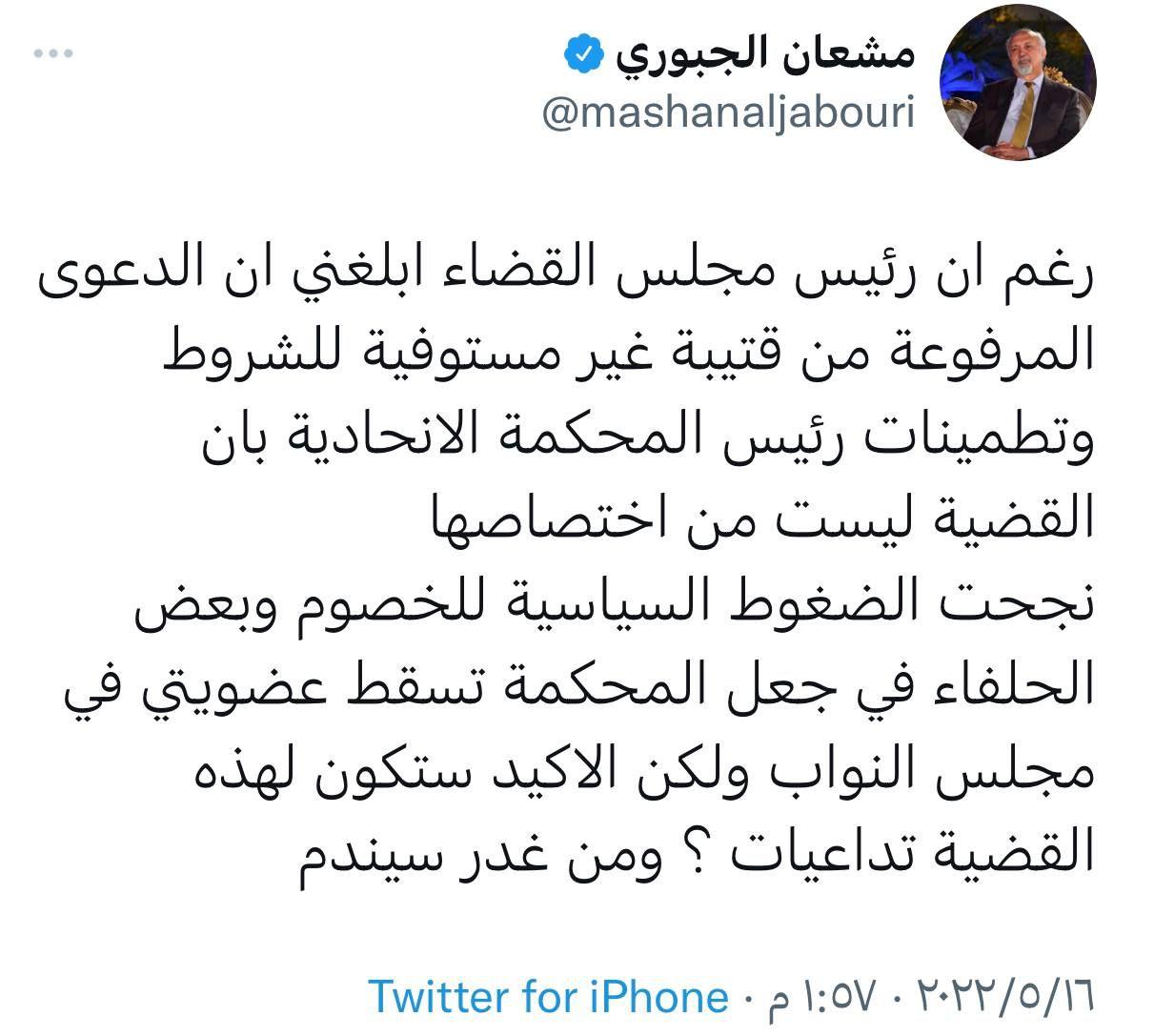 وقال الجبوري، عبر "تويتر": "رغم أن رئيس مجلس القضاء أبلغني أن الدعوى المرفوعة من قتيبة غير مستوفية للشروط وتطمينات رئيس المحكمة الاتحادية بأن القضية ليست من اختصاصها".