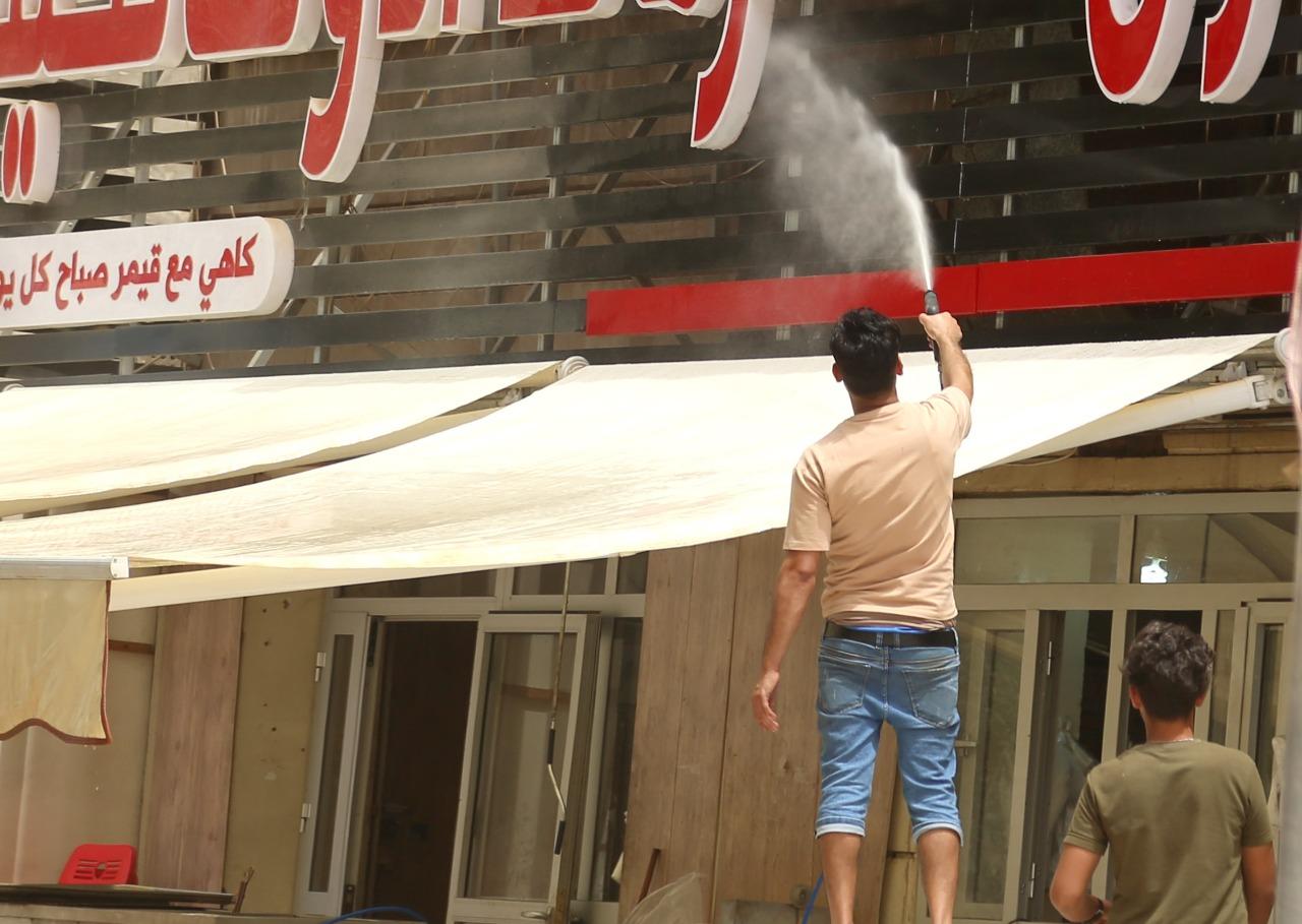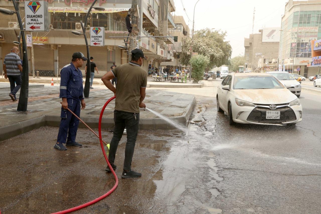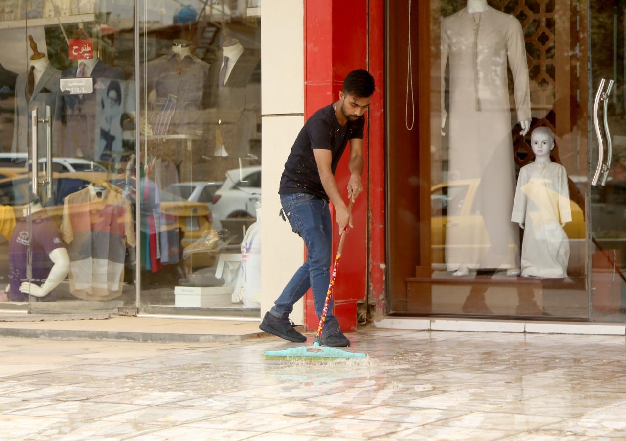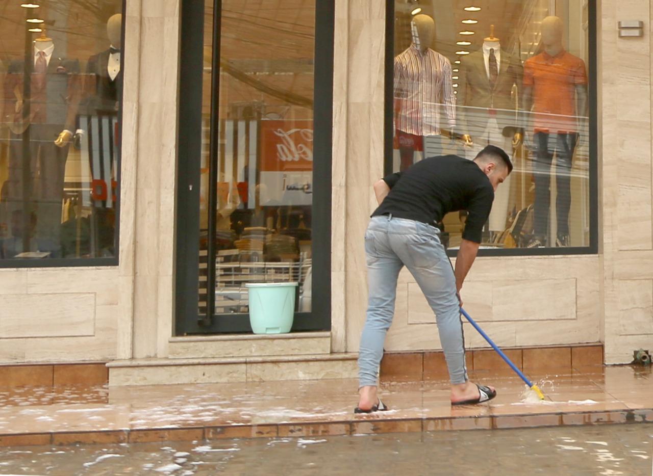 أصحاب المحال التجارية يشاركون عمال البلدية في غسل الشوارع بعد أكبر عاصفة ترابية اجتاحت البلاد.