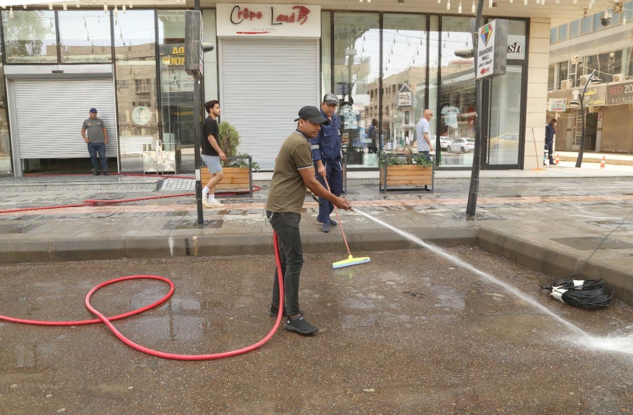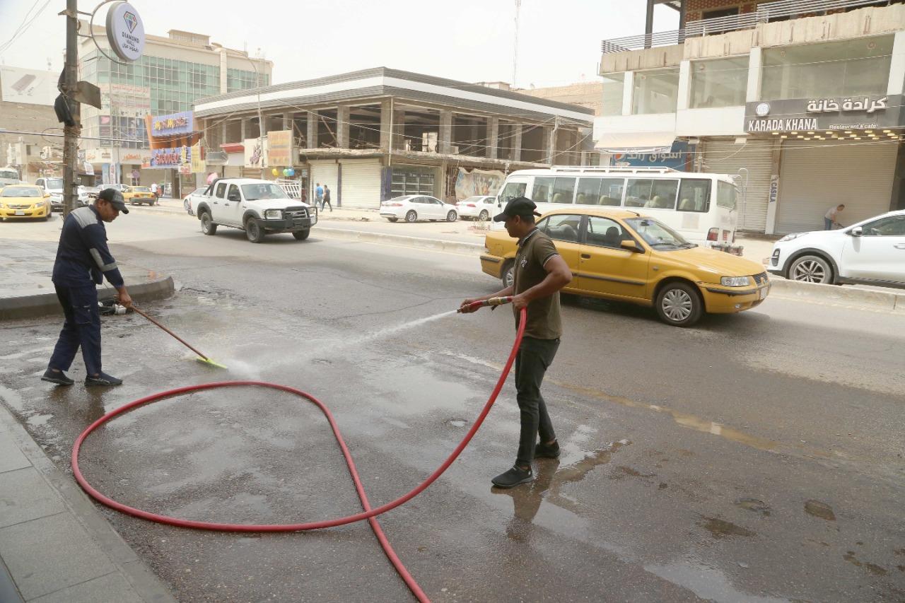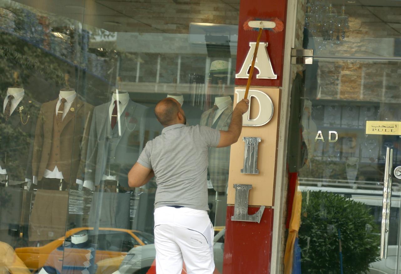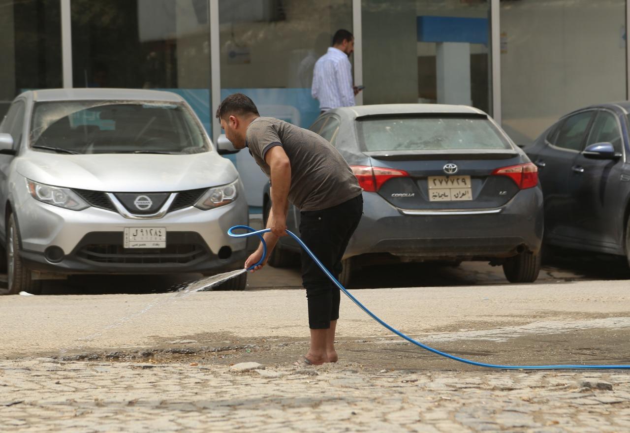 أصحاب المحال التجارية يشاركون عمال البلدية في غسل الشوارع بعد أكبر عاصفة ترابية اجتاحت البلاد.