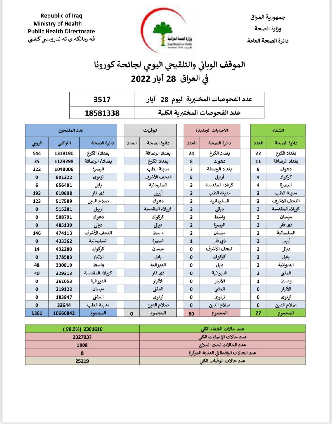 أعلنت وزارة الصحة، اليوم السبت، الموقف الوبائي اليومي لجائحة كورونا في عموم البلاد.