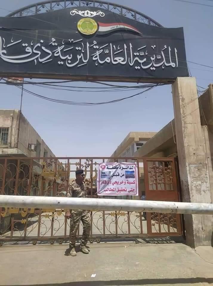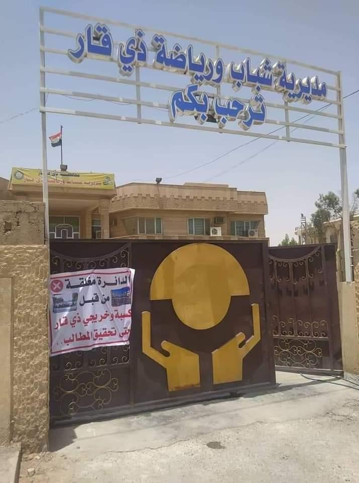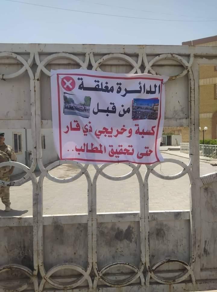 وأظهرت صور حصلت عليها (المدى)، إغلاق جميع دوائر الناصرية ووضع لافتات على أبواب تلك الدوائر كتب عليها "الدائرة مغلقة من قبل كسبة وخريجي ذي قار حتى تحقيق المطالب".