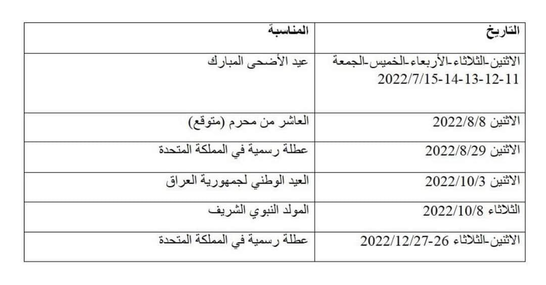 وذكر بيان للسفارة تلقته(المدى)،" تود سفارة جمهورية العراق في لندن ان تلفت عناية ابناء الجالية العراقية في المملكة المتحدة وجمهورية ايرلندا الى تعذر استقبال المراجعين في الايام المبينة في الجدول اداناه لكونها عطل رسمية.