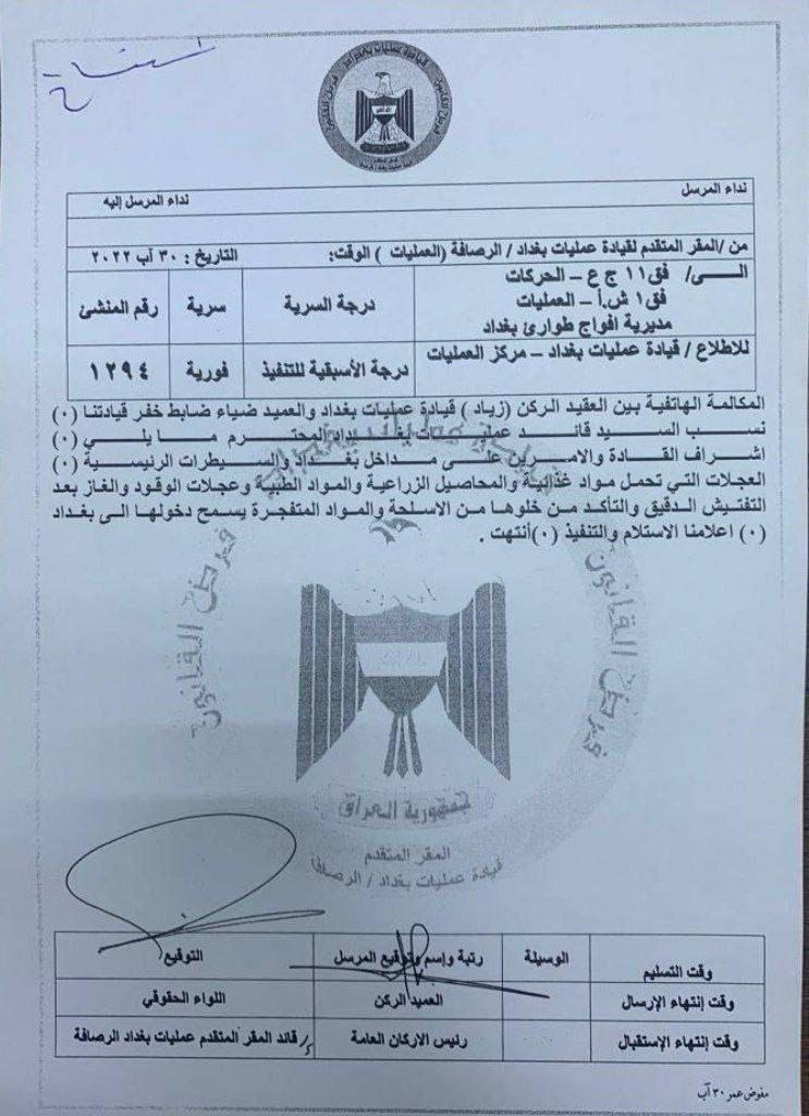 واشارت وثيقة حصلت (المدى) على نسخة منها الى، أن "قائد عمليات بغداد أمر النقاط الامنية عند مداخل العاصمة بتسهيل دخول المواد الغذائية بعد التفتيش الدقيق لها ".