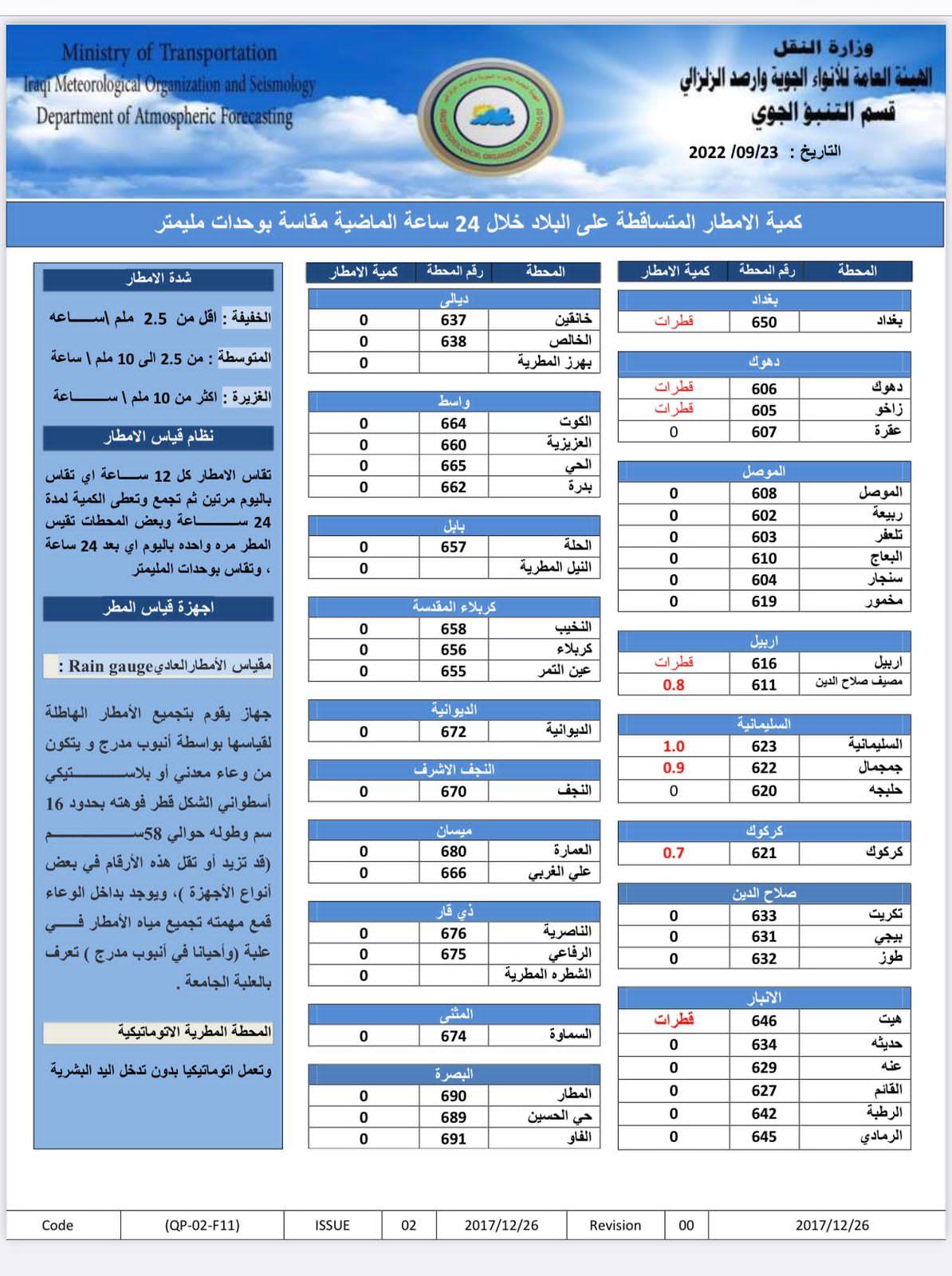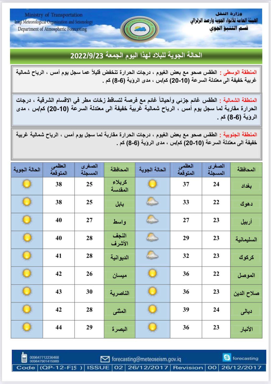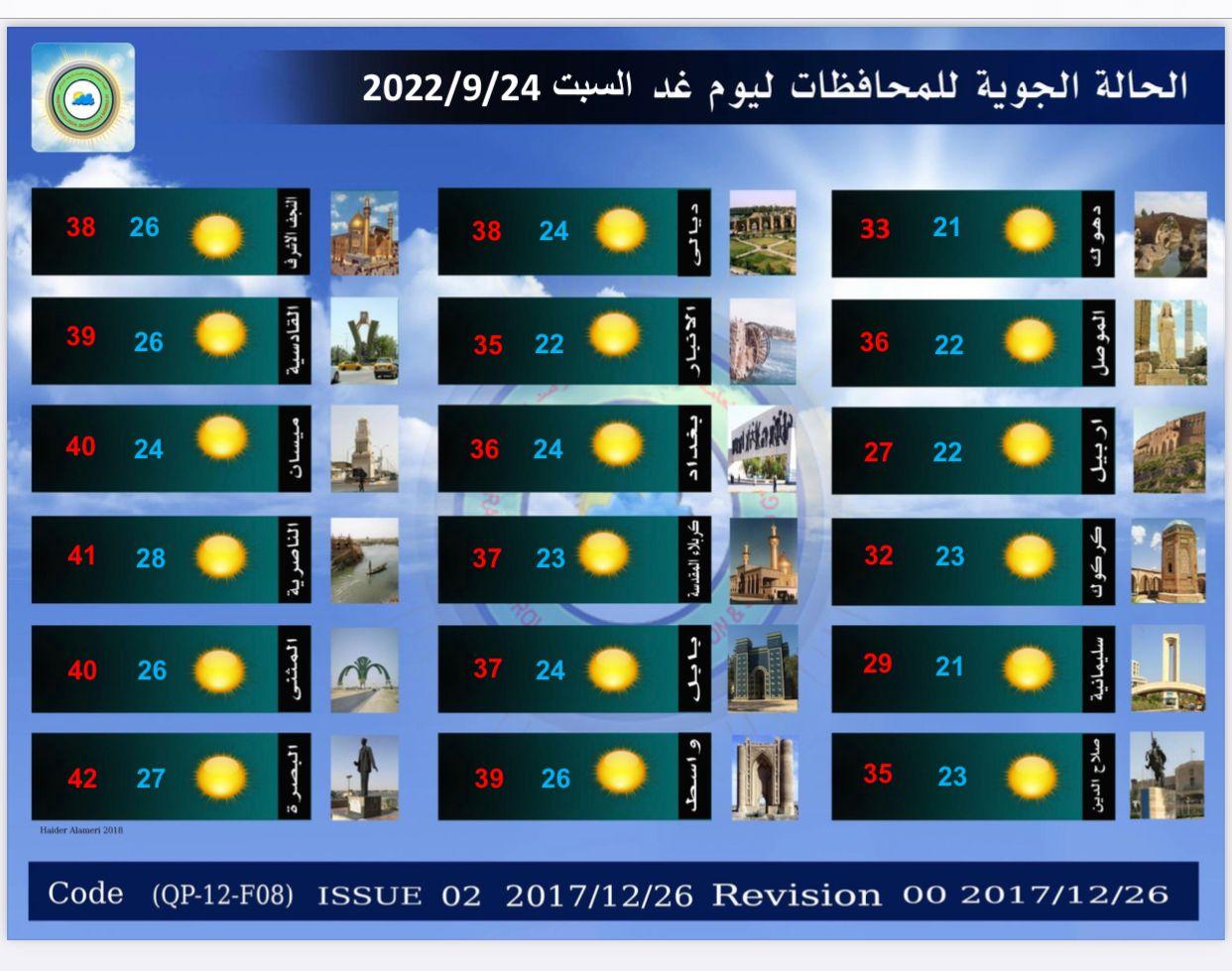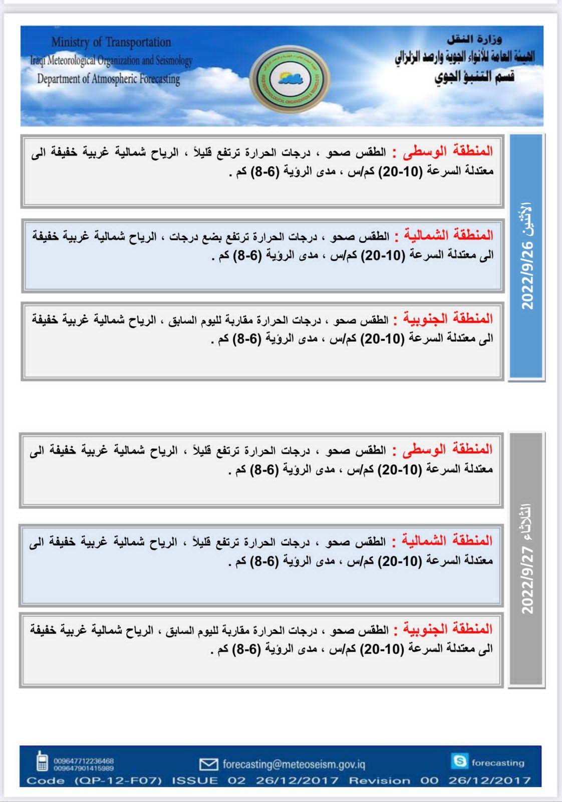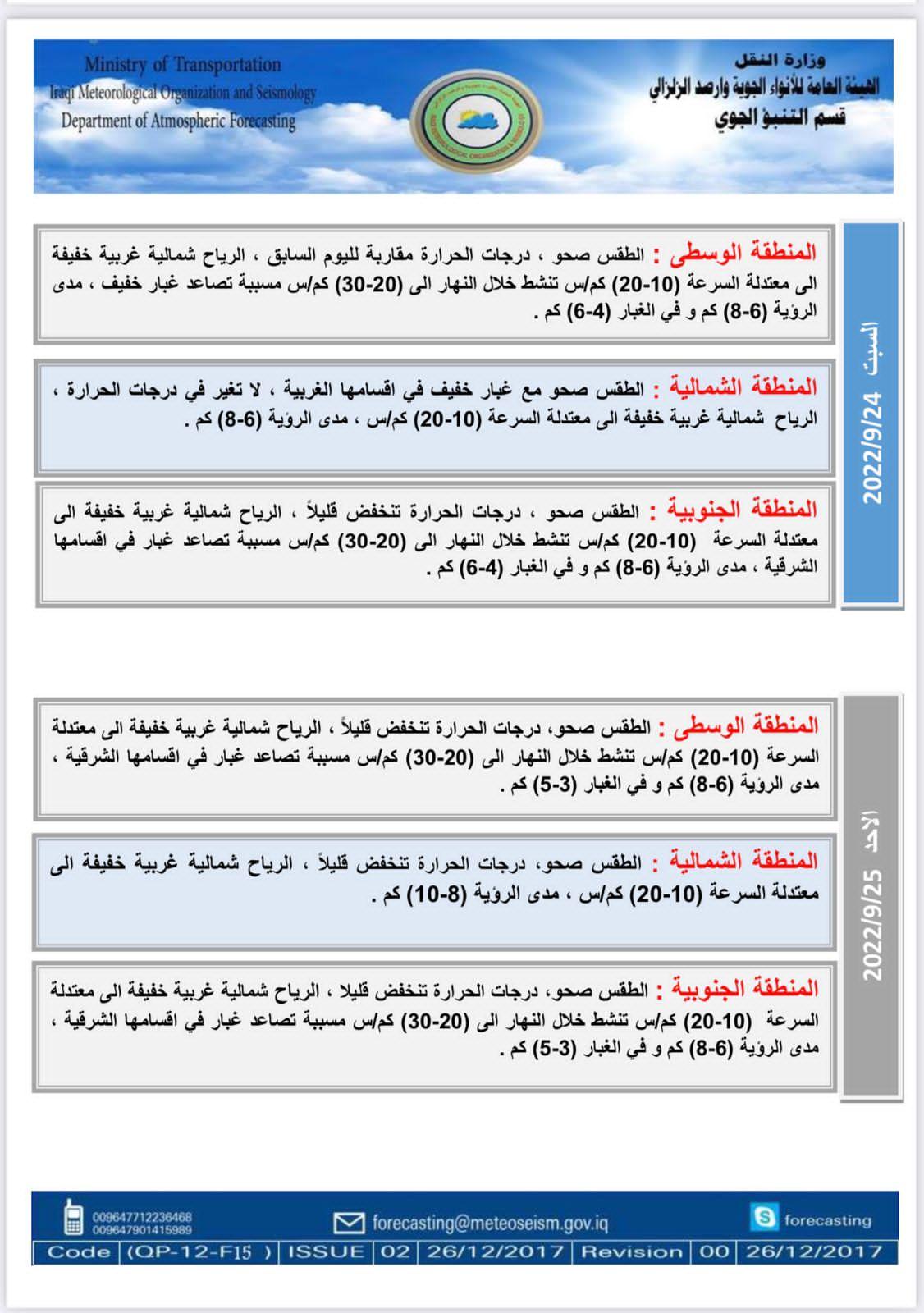 وتنشر (المدى) الجداول التي تلقتها من الهيئة، والتي تتضمن تفاصيل الحالة الجوية المتوقعة: