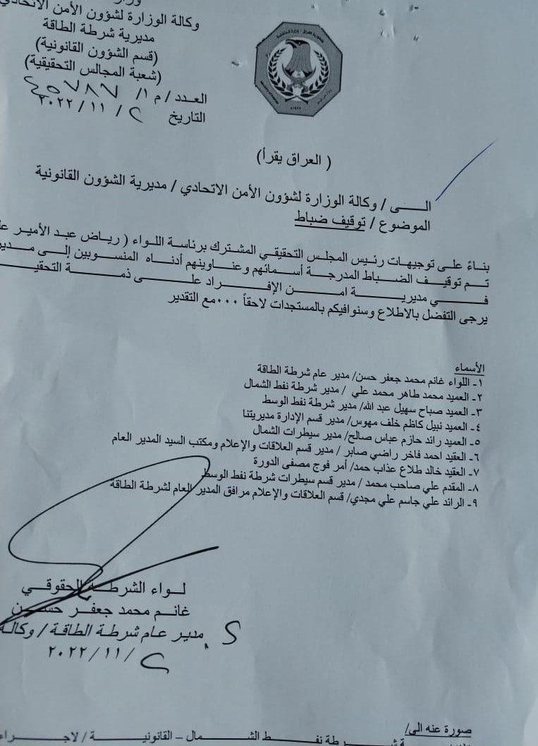 اظهرت وثيقة رسمية، اصدار اوامر بالقبض على تسعة ضباط في وزارة الداخلية على صلة بقضية تهريب النفط الخام.