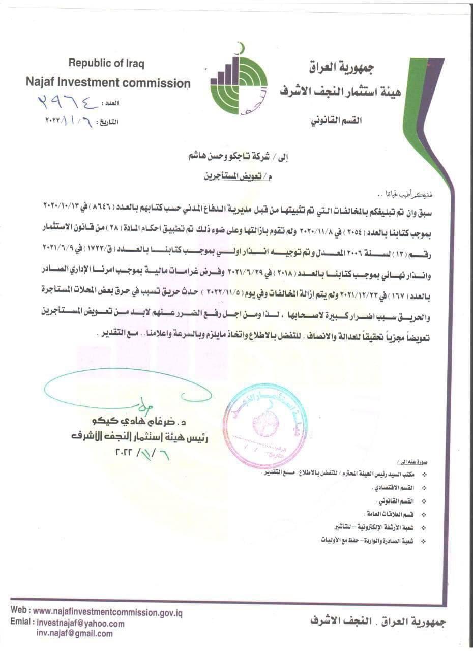 وأوضحت وثيقة حصلت (المدى) على نسخة منها، اليوم الأحد، الى أن "الهيئة خاطبت الشركات المنفذة لمشروع المدينة المائية في محافظة النجف لمطالبتهم بتعويض المتضررين جراء الحريق الذي التهم محالهم التجارية".
