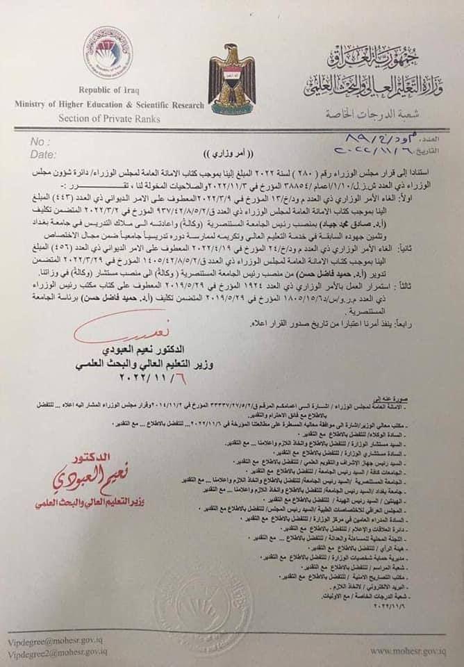 وذكرت وثيقة للتعليم العالي وحصلت (المدى) على نسخة منها، اليوم الاثنين، أنه " تقرر إلغاء تكليف صادق محمد جياد بمنصب رئاسة الجامعة المستنصرية وتكليف حميد فاضل حسن بالمنصب".