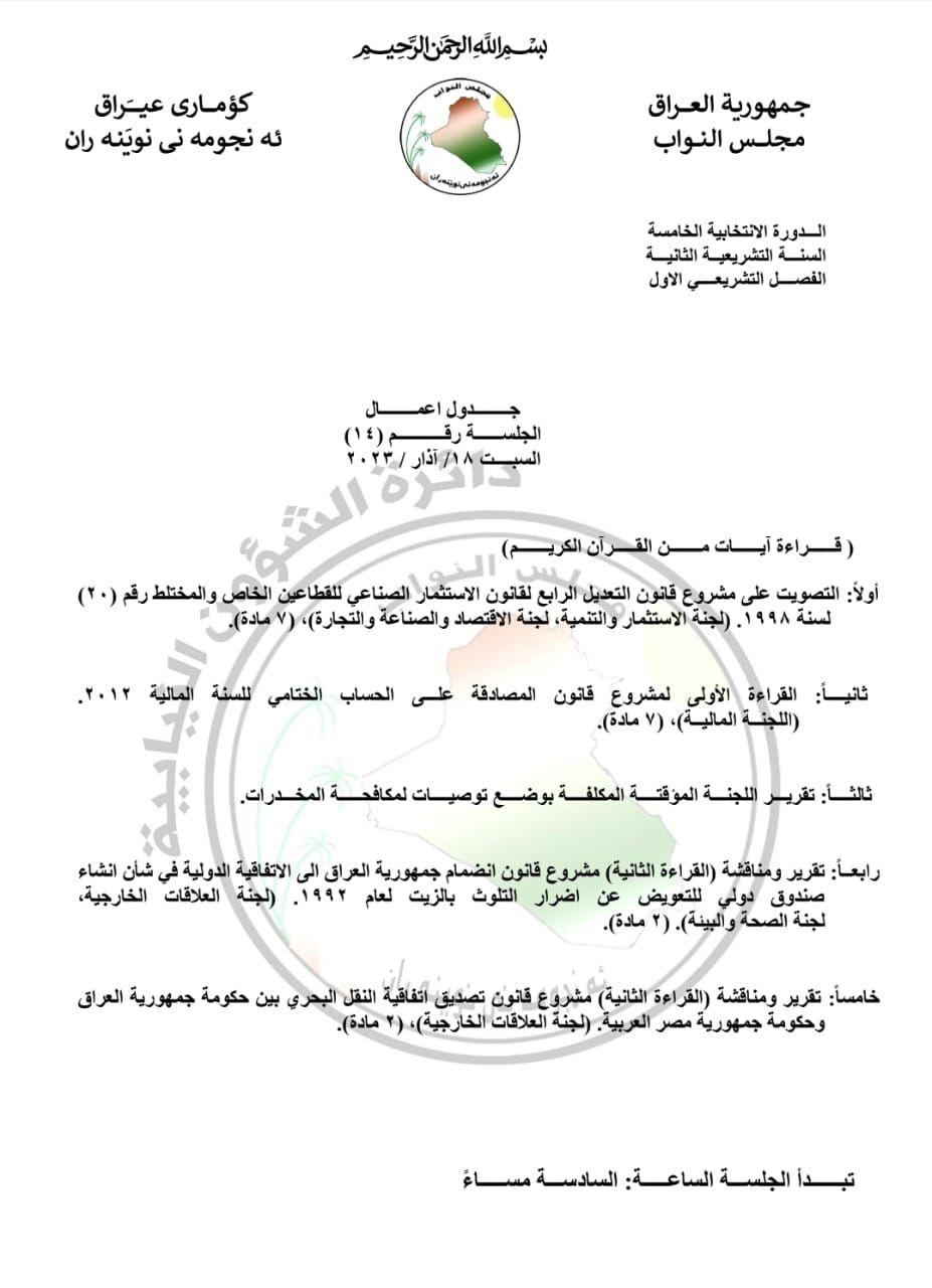 (المدى) تنشر، جدولي أعمال جلستي مجلس النواب ليومي السبت والأحد المقبلين.