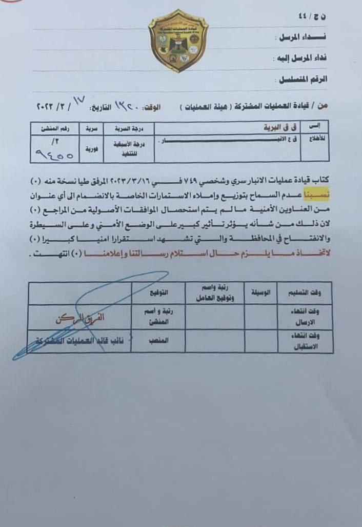 العمليات المشتركة تمنع تداول استمارة وهمية للتطوع في صحوات الأنبار