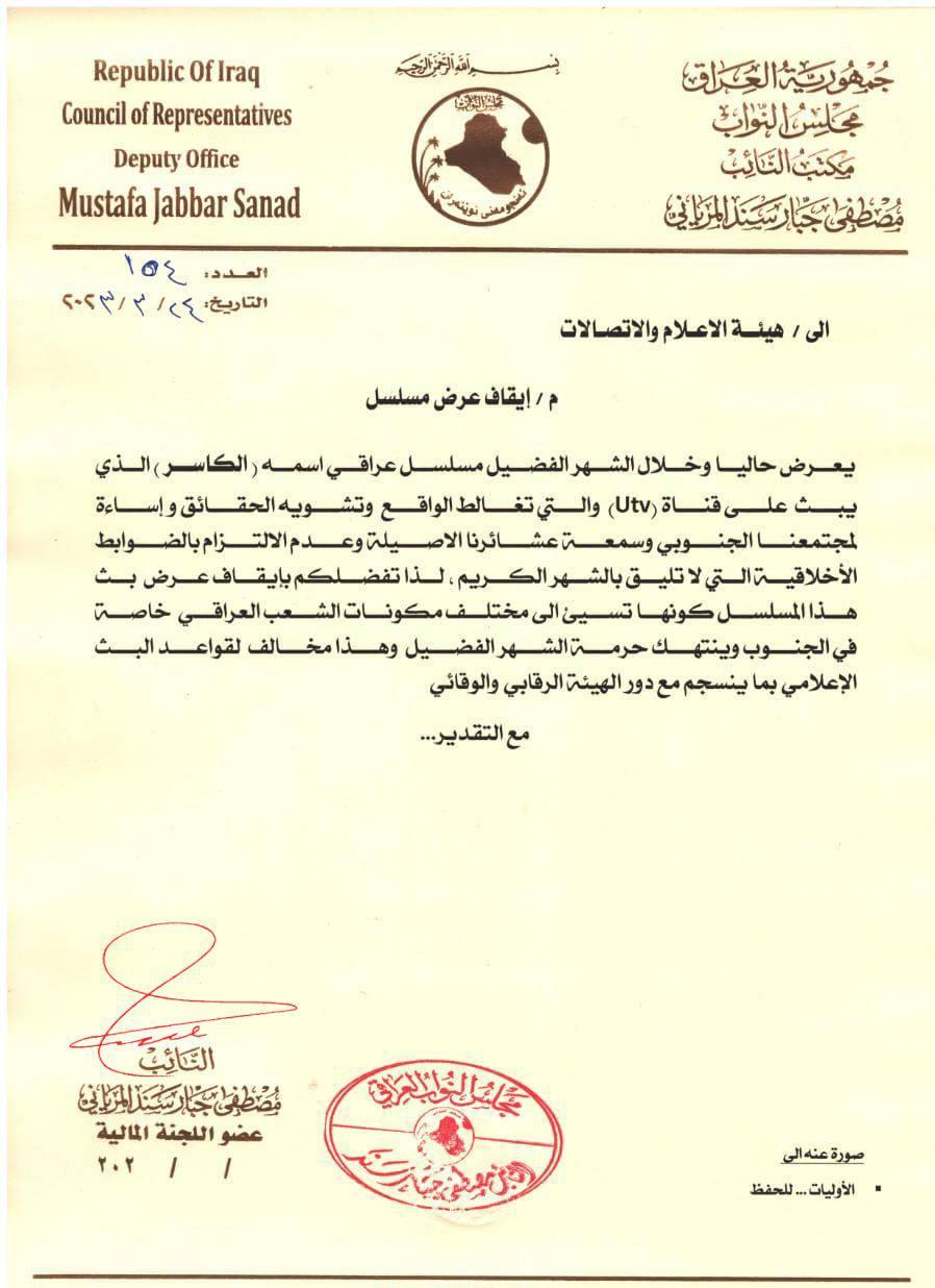 طالب النائب مصطفى جبار سند، اليوم الجمعة، هيئة الإعلام والاتصالات بإيقاف عرض مسلسل تلفزيوني رمضاني يدعى "الكاسر".