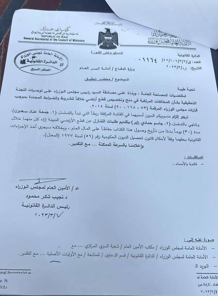 وتضمن الكتاب أنه "لمقتضيات المصلحة العامة وبناء على مصادقة رئيس مجلس الوزراء على توصيات اللجنة التحقيقية بشأن المخالفات المرتكبة في منح وتخصيص قطع اراض خلافا للشروط والضوابط المحددة، نرجو إلزام منسوبيكم (جمعه عناد سعدون) و(جاسم حمادي زاير) بتقديم طلبات التنازل عن قطع الأراضي المبينة إزاء كل منهما خلال مدة 30 يوما حفاظا على المال العام وبخلافه سيجري اتخاذ الإجراءات القانونية بحقهما وفقا لأحكام القانون.
