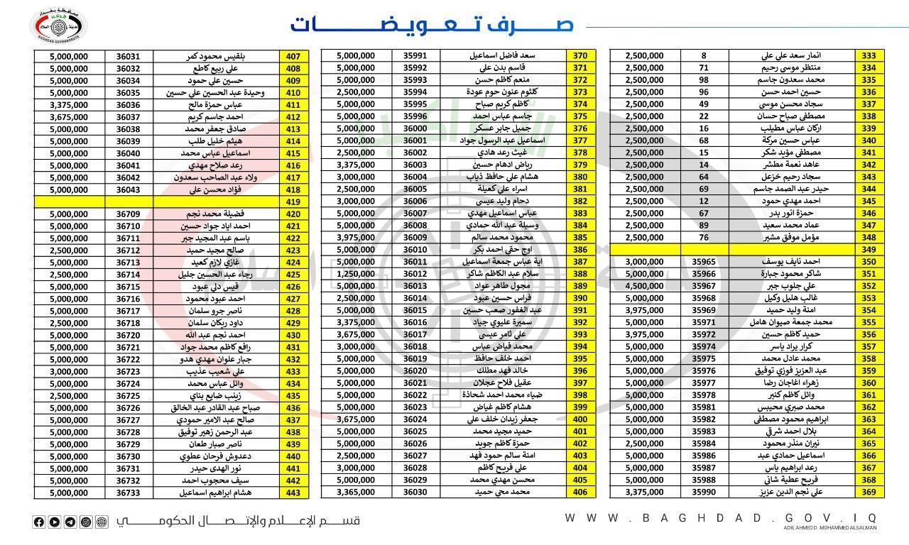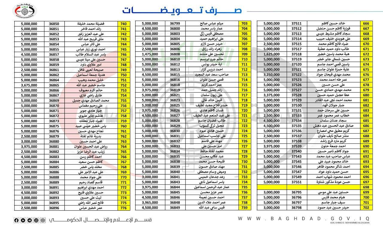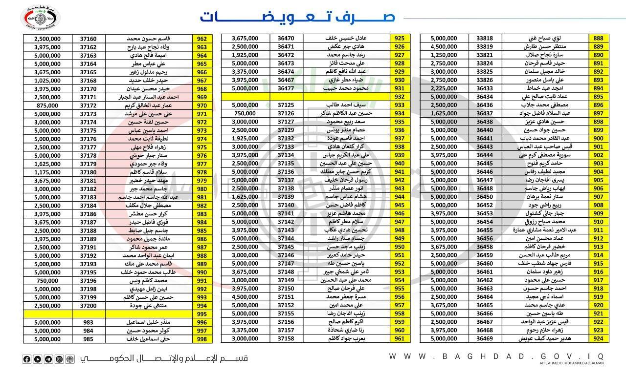 وأضاف البيان "القوائم تضم (3,187) متضرراً، بقيمة إجمالية بلغت أكثر من (12،828) مليار دينار، سيتم نشرها على شكل دفعات متفرقة، لضمان انسيابية المراجعة في دائرة التعويضات".