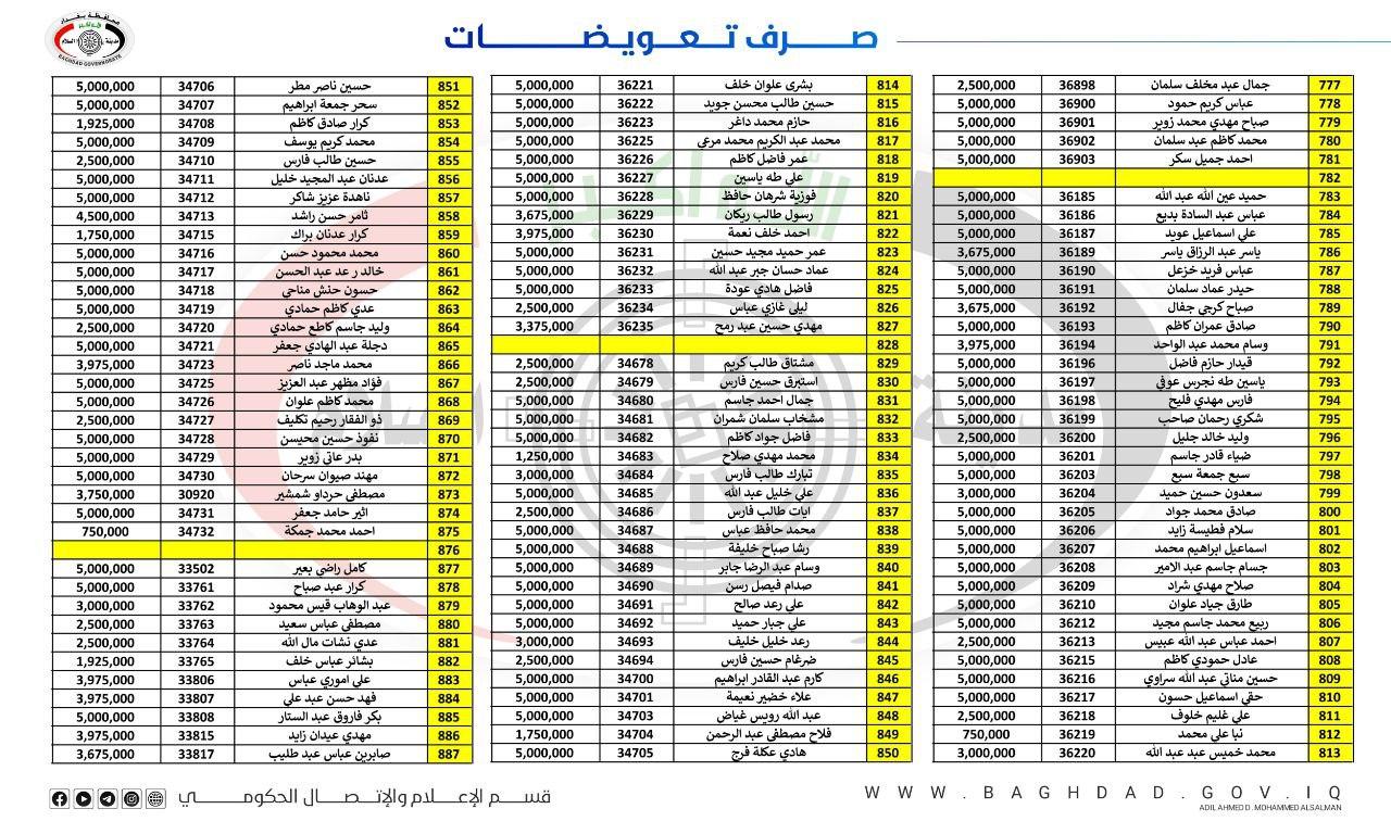 وقالت المحافظة في بيان، تلقته (المدى)، إنه "تدعو محافظة بغداد، الأسماء الواردة ضمن القوائم المبينة أدناه، إلى مراجعة دائرة التعويضات في منطقة السنك، لغرض تدقيق المعاملات واستلام الصكوك التعويضية، الخاصة بضحايا الإرهاب (شهداء ومصابين)".