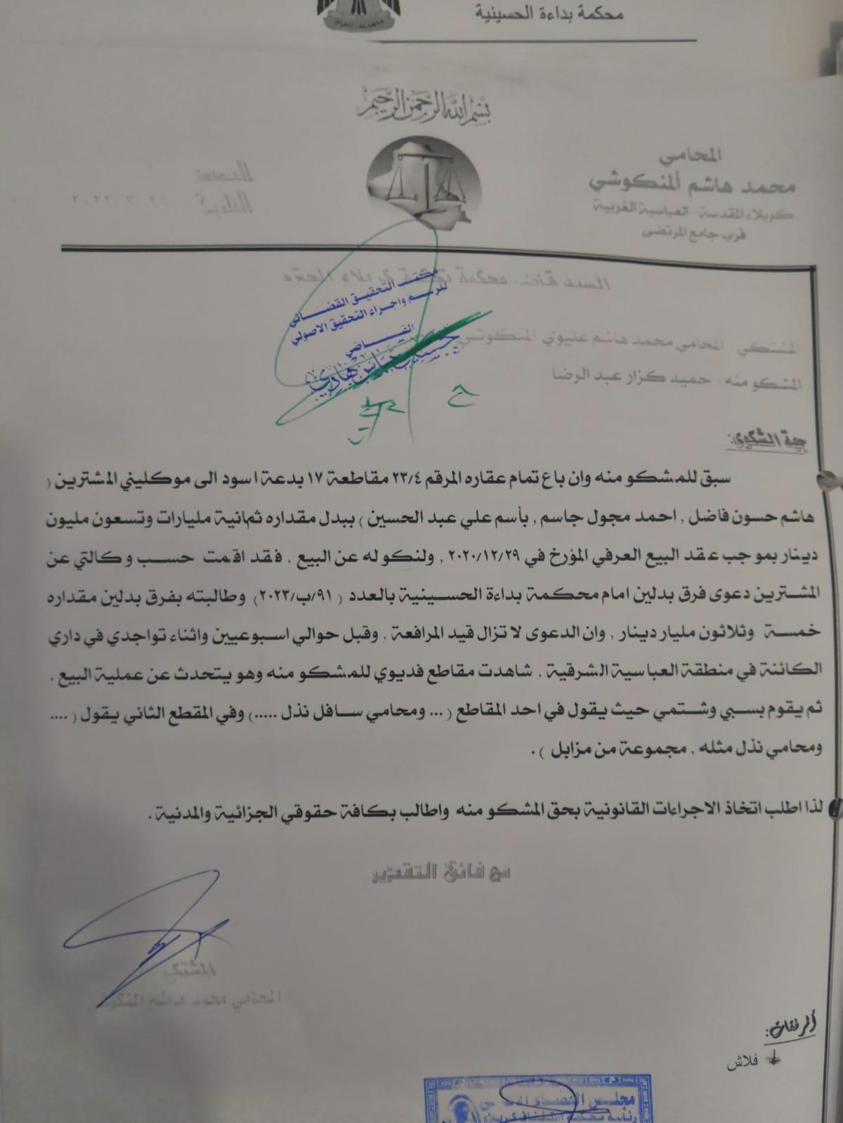 وتابع البيان، أنه "كان بإمكان المشكو منه الحضور بنفسه او ارسال من ينوب عنه من المحامين الى محكمة البداءة لتقديم دفوعه بخصوص العقار الذي باعه ونكل عن بيعه بدل من مخالفة القانون والاساءة للمحاميين والقاضي الذي ينظر الدعوى والظهور في القنوات الفضائية ووسائل التواصل الاجتماعي واثارة امور جانبية غير صحيحة ليست لها علاقة بأصل الموضوع".