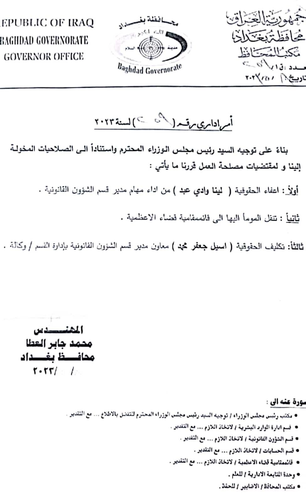 وبحسب وثيقة حصلت (المدى) على نسخة منها صادرة من مكتب محافظ بغداد وموقعة من قبل المحافظ محمد جابر العطا، تضمنت" بناءً على توجيه السيد رئيس مجلس الوزراء واستناداً الى الصلاحيات المخولة الينا ولمقتضيات مصلحة العمل، اعفاء مدير قسم الشؤون القانونية الحقوقية (لينا وادي عبد) ونقلها الى قائممقامية الاعظمية، وتكليف معاون القسم (اسيل جعفر) بدلاً عنها)".
