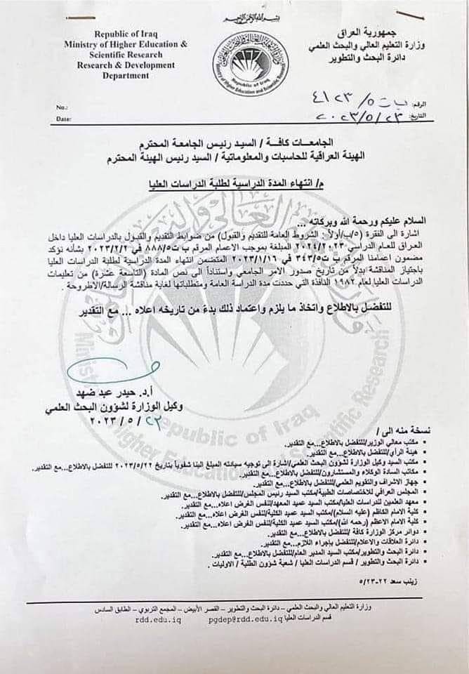 جريدة المدى > اخبار وتقارير > بالوثيقة.. التعليم العالي تحدد مدة انتهاء الدراسة لطلبة الدراسات العليا